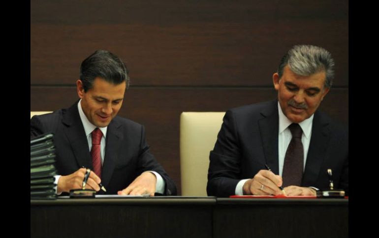 México | Presidentes Peña Nieto y Abdullah Gül firman declaración conjunta México y Turquía pactan contra el crimen organizado Presidentes Peña Nieto y Abdullah Gül firman declaración conjunta Por: NTX 17 de diciembre de 2013 - 07:06 hs El Presidente, Enrique Peña ,y su homólogo turco Abdullah Gül durante la firma de documentos. Foto: Facebook. ESPECIAL / ANKARA, TURQUÍA (17/DIC/2013).- El Presidente, Enrique Peña Nieto, y su homólogo de Turquía, Abdullah Gül, pactaron colaborar en el combate al narcotráfico y el terrorismo, además de 11 instrumentos más en diversas materias. Luego de su encuentro bilateral con comitivas que se llevó a cabo en el Palacio Cankaya, ambos mandatarios firmaron una declaración conjunta para el establecimiento de un Marco de Cooperación Estratégica y Asociación entre ambas naciones para el Siglo XXI. Atestiguaron la firma de un acuerdo de cooperación entre el gobierno de México y Turquía, para el combate a la delincuencia organizada y el terrorismo, que firmó el Procurador General de la República, Jesús Murillo Karam, y el Ministro de Economía turco Zafer Caglayan. Entre los doce documentos que firmaron los funcionarios de ambas naciones, se destaca también el convenio de cooperación sobre el combate al tráfico ilícito de estupefacientes y sustancias psicotrópicas, que firmó Murillo Karam y el Ministro del Interior de Turquía, Muammer Guler. Así como los términos de referencia del Tratado de Libre Comercio, entre el secretario de Economía, Ildefonso Guajardo Villarreal y su par de Turquía, Zafer Caglayan. En el marco de la primera visita oficial que un Presidente mexicano realiza por Turquía, el Secretario de Relaciones Exteriores, José Antonio Meade, suscribió con su contraparte turca, Ahmet Davutoglu, un memorándum de entendimiento relativo al establecimiento de una Comisión Binacional de Alto Nivel. También signaron con el Ministro de Finanzas turco, Mehmet Simsek, un acuerdo para evitar la doble imposición de gravámenes y prevenir la evasión fiscal en materia de Impuesto Sobre la Renta. Con el Ministro de Aduanas y Comercio de Turquía, Hayati Yazici, el canciller mexicano suscribió un acuerdo de asistencia administrativa mutua e intercambio de información sobre asuntos aduaneros. Asimismo, Meade Kuribreña firmó un convenio sobre servicios aéreos con un alto funcionario turco, y con el gerente general de Turk Eximbank, Hayrettin Kaplan, suscribió un memorándum de entendimiento y cooperación en créditos para la exportación. En tanto, el Secretario de Economía de México, Ildefonso Guajardo, y su contraparte de este país, Zafer Caglayan, signaron un acuerdo para la protección recíproca de las inversiones, así como los términos de referencia del Tratado de Libre Comercio. Además, suscribieron memorándum de entendimiento entre ProMéxico y la Agencia de Promoción y Apoyo a Inversiones, así como para la cooperación en ciencia y tecnología. También el memorándum de entendimiento Cooperación en Créditos a la Exportación entre el Banco Nacional de Comercio Exterior, Sociedad Nacional de Crédito (Bancomext) y Export Credit Bank of Turkeylin. Temas Gobierno de México Turquía Enrique Peña Nieto Delincuencia Lee También México y Estados Unidos refuerzan cooperación en seguridad fronteriza "Las Perdidas" serán anfitrionas de "La fiesta de disfraces mágicos Wicked" Crepúsculo: Fechas de re estreno en cines de México 2025, el año con más lluvias intensas en México desde 1941 Recibe las últimas noticias en tu e-mail Todo lo que necesitas saber para comenzar tu día Registrarse implica aceptar los Términos y Condiciones