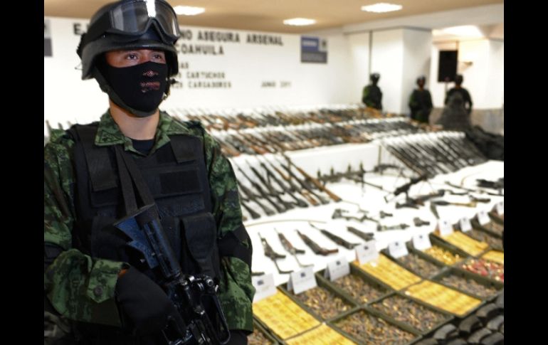 México | El material asegurado se encontraba oculto en una bodega subterránea Militares hallan arsenal de grupo criminal en Coahuila El material asegurado se encontraba oculto en una bodega subterránea Por: NTX 3 de junio de 2011 - 11:08 hs Esta mañana autoridades de la Sedena prestaron las armas y demás materiales decomisados. EFE / COAHUILA (03/JUN/2011).- Elementos de la Secretaría de la Defensa Nacional (Sedena) aseguraron en Coahuila un arsenal de 161 armas largas y cortas, casi 100 mil cartuchos, un lanzacohetes y granadas para mortero, entre otros artículos. El general de brigada Edgar Luis Villegas Meléndez, subjefe operativo del Estado Mayor de la Defensa Nacional, informó que este arsenal fue asegurado en el ejido Las Sardinas, del municipio San Buenaventura. En la sede de la Sedena, el jefe militar explicó que personal de la Sexta Zona Militar con sede en Coahuila obtuvo información de inteligencia que señalaba posibles actividades ilícitas en un inmueble, por lo que se iniciaron trabajos para la localización y aseguramiento de las armas. De esta manera se encontraron en el interior de una bodega subterránea en dicho ejido miles de cartuchos y decenas de armas, así como equipo táctico que se presume guardaban ahí delincuentes de la organización delictiva de 'Los Zetas'. Villegas Meléndez indicó que en ese lugar había 154 armas largas, siete cortas, 92 mil 39 cartuchos de diferentes calibres, cuatros mil 629 cargadores, 10 armas desarticuladas, un lazacohetes y dos cohetes. También se encontraron cuatro granadas para mortero, dos ballestas, un vehículo, 435 fornituras, cuatro mil 735 accesorios para fornituras, 31 cargadores para radio y diversos equipos, así como vestuario tipo militar. Temas Sedena Estados Coahuila Lee También Revelan llamada al 911 con que se reportó la muerte de Diane Keaton SMN advierte lluvias y bajas temperaturas en México esta semana Elementos de seguridad detienen a traficante sueco en Cancún Organismo internacional prevé tensión comercial a nivel global en 2026 Recibe las últimas noticias en tu e-mail Todo lo que necesitas saber para comenzar tu día Registrarse implica aceptar los Términos y Condiciones