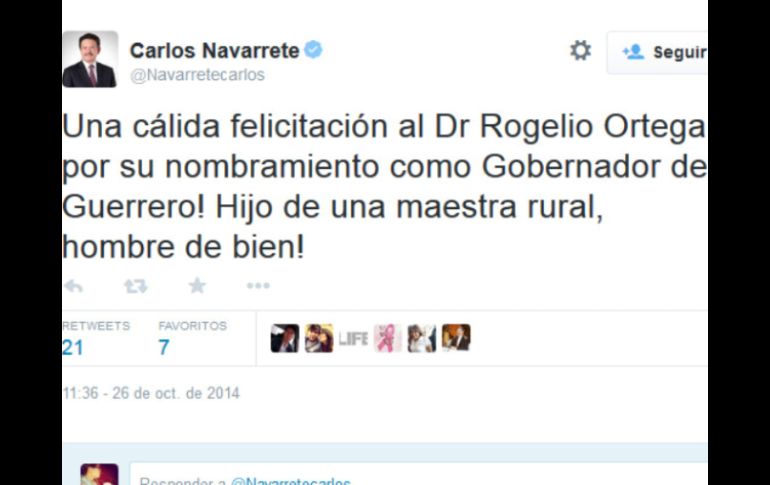 México | El líder nacional del PRD felicita al recién nombrado gobernador sustituto de Guerrero Navarrete felicita a Rogelio Ortega por su nombramiento El líder nacional del PRD felicita al recién nombrado gobernador sustituto de Guerrero Por: SUN 26 de octubre de 2014 - 11:09 hs 'Una cálida felicitación al Dr Rogelio Ortega por su nombramiento como Gobernador de Guerrero', escribe Navarrete. TWITTER / @Navarretecarlos CIUDAD DE MÉXICO (26/OCT/2014).- El líder nacional del Partido de la Revolución Democrática (PRD), Carlos Navarrete, felicitó al recién nombrado gobernador sustituto de Guerrero, Rogelio Ortega. En su cuenta de twitter, Navarrete expresó: Una cálida felicitación al Dr Rogelio Ortega por su nombramiento como Gobernador de Guerrero! Hijo de una maestra rural, hombre de bien! El Congreso de Guerrero realizó una votación en donde por mayoría fue elegido Ortega Martínez, quien se desempeñaba como ex secretario general de la Universidad Autónoma de Guerrero. Ortega Martínez deberá concluir el periodo para el cual fue electo el gobernador con licencia, Ángel Aguirre Rivero, el cual concluirá en octubre del próximo año. Temas PRD Estados Carlos Navarrete Guerrero Twitter Redes Sociales Lee También Lluvias dejan 29 muertos en un día en México Trump anuncia aranceles del 100% para China por su postura comercial 'hostil' Detienen a Miguel Ángel 'N', vinculado por el homicidio del sacerdote Bertoldo Pantaleón SMN advierte: Tormenta Raymond dejará lluvias intensas y fuertes vientos en 4 estados Recibe las últimas noticias en tu e-mail Todo lo que necesitas saber para comenzar tu día Registrarse implica aceptar los Términos y Condiciones