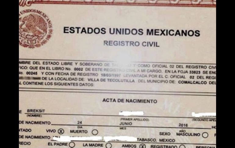 México | Los padres tabasqueños hicieron una adaptación del término para llamar a su hija Nombran a una niña mexicana 'Breksit' tras el referendo en Reino Unido Unos padres tabasqueños hicieron una adaptación del término 'Brexit' para nombrar a su hija Por: EFE 27 de junio de 2016 - 21:25 hs En una fotografía del acta de nacimiento original se observa 'Breksit' como nombre propio de la menor. TWITTER / @_snowglow CIUDAD DE MÉXICO (27/JUN/2016).- Una niña fue registrada por sus padres como "Breksit" en Tabasco, un día después de que en el Reino Unido se realizara un referendo en el que los británicos votaron por retirar a su país de la Unión Europea (UE), acción denominada "Brexit". En una fotografía del acta de nacimiento original, que circula en redes sociales y medios locales, se observa "Breksit" como nombre propio de la menor, y que la fecha de registro es el 24 de junio de 2016. El resto de los datos están ocultos. El término Brexit es una abreviatura de las palabras en inglés British (británico/a) y exit (salida), en referencia al movimiento que apoyaba la salida británica de la UE, postura que ganó con 51.9 por ciento de los votos en el referendo. La amplia difusión del término alcanzó a los padres de la menor, que decidieron nombrarla con una adaptación del mismo: Breksit. En México existen diversas regulaciones sobre el registro de los nombres propios. El artículo 58 del Código Civil para la Ciudad de México señala que "el juez del Registro Civil exhortará a quien presente al menor para que el nombre propio con el que se pretende registrar no sea peyorativo, discriminatorio, infamante o denigrante". En Sonora el Registro Civil publicó en 2014 una lista de nombres que prohíbe usar para registrar a los menores del estado, entre los que figuran "Facebook", "Twitter" y "Robocop". Desde 2007, en Coahuila, Baja California Sur, Chihuahua, Durango, Jalisco, Querétaro, Quintana Roo y San Luis Potosí, el Código Civil fue modificado para prohibir a los padres usar nombres peyorativos o que puedan ser ridículos para registrar a sus hijos. En los demás estados de México hay plena libertad de los padres para nombrar a sus hijos de cualquier manera y usar hasta 10 nombres. Temas Tabasco Curiosidades y absurdos Estados Lee También ¿Cuándo la tormenta tropical "Raymond" estará cerca de Jalisco? Angelina Jolie planea dejar EU por diferencias con gobierno de Trump Trump dijo merecer Nobel de la Paz por haber "terminado con siete guerras" ¿Trump ganaría el Nobel de la Paz? Veteranos del Comité de premiación responden Recibe las últimas noticias en tu e-mail Todo lo que necesitas saber para comenzar tu día Registrarse implica aceptar los Términos y Condiciones