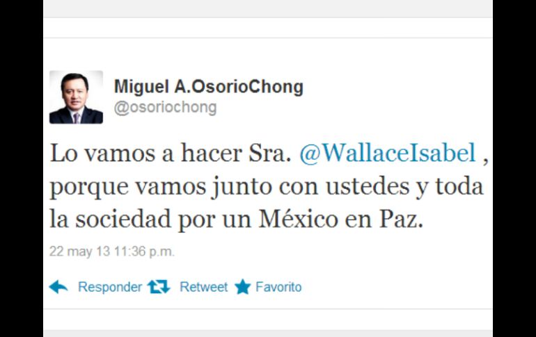 México | El titular de la Segob asegura que trabajará con la sociedad por un México en paz Osorio asegura que se depurarán policías en Michoacán El titular de la Segob asegura que el Gobierno trabajará con organizaciones civiles y la sociedad por un México en paz Por: NTX 22 de mayo de 2013 - 19:34 hs El titular de la Segob responde a la presidenta de Alto al Secuestro que la depuración ''va en serio''. TOMADA DE @osoriochong / CIUDAD DE MÉXICO (22/MAY/2013).- El secretario de Gobernación, Miguel Ángel Osorio Chong, aseguró que se depurarán los cuerpos policiales en Michoacán, y con las organizaciones civiles y la sociedad se trabajará por un México en paz. Ello en respuesta a Isabel Miranda de Wallace, quien mediante su cuenta en Twitter @WallaceIsabel preguntó al funcionario federal si la depuración policial en esa entidad iba en serio. La presidenta de la organización Alto al Secuestro escribió en la red social: "@osoriochong secretario va en serio la depuración de la policía en Michoacán? porque siempre dicen lo mismo y se queda en intenciones". En ese marco, el titular de la Secretaría de Gobernación (Segob) le respondió: "Lo vamos a hacer Sra. @WallaceIsabel, porque vamos junto con ustedes y toda la sociedad por un México en Paz". Temas Michoacán Estados Isabel Miranda de Wallace Miguel Ángel Osorio Chong Recibe las últimas noticias en tu e-mail Todo lo que necesitas saber para comenzar tu día Registrarse implica aceptar los Términos y Condiciones