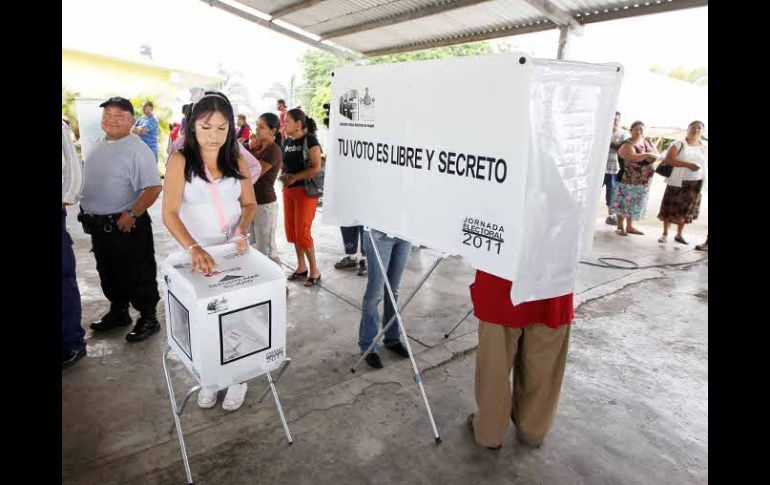 México | Martha Elena García afirma que aventaja por un margen de 3.16% a Roberto Sandoval PAN se proclama ganador en Nayarit Martha Elena García afirma que aventaja por un margen de 3.16% a Roberto Sandoval Por: SUN 3 de julio de 2011 - 19:41 hs Votantes acuden a una casilla en Tepic, Nayarit. E. PACHECO / - Sandoval dice que gana en NayaritTEPIC, NAYARIT (03/JUL/2011).- La candidata del Partido Acción Nacional (PAN) a la gubernatura de Nayarit, Martha Elena García, salió a proclamar su triunfo por un margen de 3.16% de diferencia, respecto del Partido Revolucionario Institucional (PRI), con base en los datos que le aportó una encuestadora propia. La aspirante a la gubernatura anunció que se dirigirá al Monumento a la Hermana Agua, a festejar con sus seguidores, el haber vencido, dijo, a la coalición del PRI-PVEM-Panal. En conferencia de prensa, posterior al anuncio del priista Roberto Sandoval, quien se declaró ganador, Martha Elena García dijo que su encuestadora es la empresa "Monitor e Indicadores". Según sus datos, ella obtuvo 40.3% de los votos; el PRI, 37.15%, y el PRD 10.05%. Acompañaron a la candidata García, el delegado del Comité Ejecutivo Nacional (CEN) del PAN, Herbert Taylor, así como el presidente del panismo nayarita, Ramón Cambero. Temas Estados Nayarit Elecciones 2011 Recibe las últimas noticias en tu e-mail Todo lo que necesitas saber para comenzar tu día Registrarse implica aceptar los Términos y Condiciones