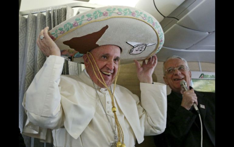 México | Francisco recibió presentes de los reporteros que lo acompañan en su viaje Papa se pone sombrero de Charro y bromea camino a México Francisco recibió presentes de los reporteros que lo acompañan en su viaje Por: NTX 12 de febrero de 2016 - 05:45 hs AVIÓN PAPAL (12/FEB/2016).- El Papa Francisco se divirtió hoy poniéndose un sombrero de charro, dedicando libros, recibiendo cartas y regalos varios, haciendo bromas sobre el futbol argentino, tomándose autofotos y escuchando mensajes de gente común. Todo esto a bordo del avión papal, en el periplo que lo lleva de Roma a La Habana, donde convivió animadamente durante más de 45 minutos con los 75 periodistas que lo acompañan en la comitiva. Luego de un despegue atrasado en casi 40 minutos por exceso de tráfico aéreo en la base Leonardo Da Vinci de Fiumicino, a las afueras de Roma, y de un desayuno para todos los pasajeros, el jerarca de la Iglesia católica apareció en el sector turista. Allí dedicó unas palabras de saludo a todos los presentes y recordó que la decana de los vaticanistas, Valentina Alazraki, le había regalado unas películas del cómico Cantinflas y que así lo hizo entrar "como en un túnel del tiempo". "Así entré en México por la puerta de Cantinflas que hace reir mucho", señaló bromeando. Luego agradeció al organizador de los viajes papales, Alberto Gasbarri, sus 47 años de servicio en el Vaticano y sus 37 en su puesto actual. "Entró cuando tenía tres o cuatro años", agregó entre risas, antes de pedir que lo feliciten porque es su último viaje antes de despedirse. Para él pidió "una festichola" y luego presentó a su sucesor, el clérigo colombiano Mauricio Rueda Beltz. Antes de comenzar a saludar uno por uno a los periodistas, Bergoglio recibió un sombrero de charro con una imagen de Nuestra Señora de Guadalupe y se lo colocó emocionado, como lo hicieran Juan Pablo II y Benedicto XVI. De manos del corresponsal de Notimex, Andrés Beltramo Alvarez, Francisco recibió algunas cartas de niños del Estado de Puebla y también un mantel para tomar la bebida típica argentina, el mate. Con él bromeó también con la victoria de su equipo de futbol, San Lorenzo de Almagro, por 4 a 0 contra el Boca Juniors en la final de la Supercopa Argentina. Preguntó cuál había sido el resultado del partido y después consoló a los aficionados de Boca diciendo que a los "cuervos" les gusta la pizza, pero más el "caldo de gallina", haciendo referencia a River Plate, cuyos aficionados son conocidos como "gallinas". Más adelante recibió regalos de todo tipo: unos zapatos tenis para "caminar México", dos bolsas de café colombiano que el Papa pidió a sus colaboradores "que no se pierda por ahí", libros, revistas, una canasta de dulces y hasta dos rosas blancas. Temas El Papa Francisco en México Papa - Detalles Recibe las últimas noticias en tu e-mail Todo lo que necesitas saber para comenzar tu día Registrarse implica aceptar los Términos y Condiciones