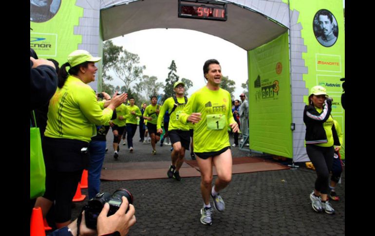 México | El Presidente recorre una distancia de 10 kilómetros en un tiempo de 54:08 minutos Peña Nieto concluye carrera Molino del Rey Tras recuperarse de esta actividad física, el Mandatario entregó premios a los ganadores de las diversas categorías que se dieron en la competencia Por: SUN 13 de julio de 2013 - 09:29 hs El Presidente Enrique Peña Nieto concluyó su participación en la tercera carrera Molino del Rey. ESPECIAL / CIUDAD DE MÉXICO (13/JUL/2013).- El Presidente Enrique Peña Nieto concluyó su participación en la tercera carrera Molino del Rey, organizada por el Estado Mayor Presidencial en Chapultepec. El mandatario recorrió una distancia de 10 kilómetros en un tiempo de 54:08 minutos, acompañado del jefe del Estado Mayor Presidencial, general Roberto Miranda, quien corrió sólo 5 kilómetros, con un tiempo de 38 minutos. Tras recuperarse de esta actividad física, el Presidente entregó premios a los ganadores de las diversas categorías que se dieron en la competencia. Al finalizar, el Presidente convivió con asistentes, deportistas y porristas del equipo de futbol americano Centinela, del cuerpo de guardias presidenciales. Temas Gobierno de México Oficina de la Presidencia de la República Enrique Peña Nieto Lee También Liverpool: ¡Laptops en menos de 5 mil pesos que no te puedes perder! Zague aseguró que "no existe calidad" en el futbol mexicano Esposa de Salinas Pliego responde si el empresario se lanzará para presidente Suman 48 muertos y miles de damnificados por lluvias en cinco estados Recibe las últimas noticias en tu e-mail Todo lo que necesitas saber para comenzar tu día Registrarse implica aceptar los Términos y Condiciones