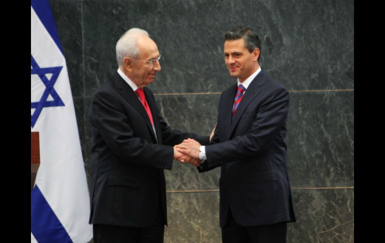"Hoy recibí a uno de los hombres más reconocidos de nuestros tiempos, el Señor Shimon Peres, Presidente del Estado de Israel", escribió el mandatario en su cuenta @EPN. En un mensaje posterior, el jefe del Ejecutivo federal destacó que "Durante su Visita de Estado refrendamos nuestros lazos de amistad y firmamos convenios de cooperación bilateral". El presidente Peña ofrece esta noche una cena en honor del mandatario israelí.