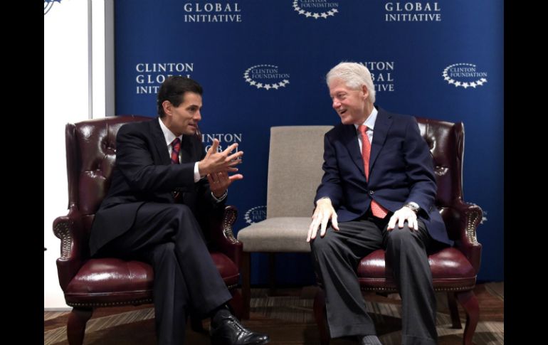 México | Hablaron sobre la agenda global en materia de medio ambiente Peña Nieto dialoga con Clinton sobre cambio climático Hablaron sobre la agenda global en materia de medio ambiente en el marco de la Asamblea de la ONU Por: NTX 28 de septiembre de 2015 - 16:32 hs NUEVA YORK, ESTADOS UNIDOS (28/SEP/2015).- El Presidente Enrique Peña Nieto se reunió este lunes con el ex mandatario estadounidense William Clinton, como parte de sus actividades en el marco de la 70 Asamblea General de la Organización de las Naciones Unidas. La agenda global en materia de ambiente y los efectos del cambio climático fueron los temas sobre los que el Ejecutivo federal habló con el ex gobernante de Estados Unidos, quien encabeza la Reunión Anual de la Clinton Global Initiative 2015. En el encuentro les acompañaron la secretaria de Relaciones Exteriores, Claudia Ruiz Massieu Salinas; el embajador de México en Estados Unidos, Miguel Basáñez Ebergenyi, y el jefe de la Oficina de la Presidencia, Francisco Guzmán Ortiz, entre otros funcionarios. Temas Gobierno de México Cambio Climático Bill Clinton Enrique Peña Nieto ONU Asamblea General de la ONU Lee También La aristocracia del Bienestar Buscan entregar apoyos a damnificados por lluvias Cartucho México hará ajustes a los aranceles a países asiáticos Recibe las últimas noticias en tu e-mail Todo lo que necesitas saber para comenzar tu día Registrarse implica aceptar los Términos y Condiciones