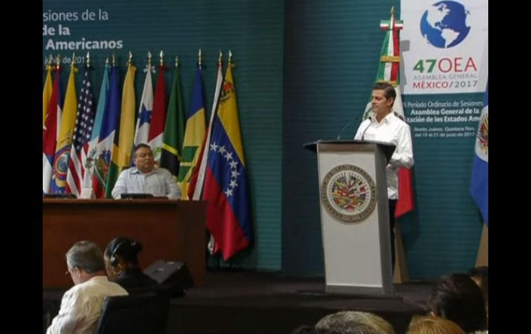 CANCÚN, QUINTANA ROO (19/JUN/2017).- El Presidente de México, Enrique Peña Nieto, declaró hoy inaugurado la 47 Asamblea General de la OEA, que se celebra en Cancún, Quintana Roo, del 19 al 21 de julio."Confío que en esta Asamblea General lograremos resultados trascendentes en cada uno de estos temas desde un diálogo constructivo, respeto mutuo y colaboración estrecha", dijo el Mandatario.La inauguración de la cita anual más importante de la OEA arrancó con retraso tras una jornada marcada por la falta de consenso de los cancilleres de los países miembros en torno a una declaración conjunta sobre la crisis en Venezuela.El lema oficial de la Asamblea es "Fortaleciendo el diálogo y la concertación para la prosperidad", y en la cita se celebrarán una serie de diálogos en los que se abordarán temas como la migración o los derechos de los pueblos indígenas.No obstante, el asunto de fondo, que definirá la cita y ha protagonizado la primera jornada, es la posición de la región en torno a Venezuela.La nación caribeña, a pesar de anunciar su salida de la OEA en abril -que no se hará efectiva en 2019- tiene una importante representación oficial en esta máxima cita anual de la OEA.El canciller de México, Luis Videgaray, destacó que es una "gran alegría" para el país ser por "primera vez" sede de la Asamblea General de la OEA, esperando que el diálogo entre naciones lleve a una mayor prosperidad.En su turno de palabra, el secretario general de la OEA, Luis Almagro, destacó que la "democracia" es un derecho de los pueblos.Sin hacer referencia explícita a Venezuela, habló de la gente que fallece defiendo la democracia. "Cada muerte nos ha abierto más las puertas de las libertades", indicó.La máxima cita anual de la OEA se celebra hasta el miércoles en el hotel Moon Palace de Cancún, en el Caribe mexicano.Este martes se llevará a cabo la primera plenaria, durante la cual Bolivia presentará el informe de su Presidencia de la Asamblea General y se elegirá al país que lo sucederá en dicha labor.Los ministros de Exteriores sostendrán su primer diálogo público hasta las 13:00 horas, al término del cual mantendrán un encuentro privado de dos horas.