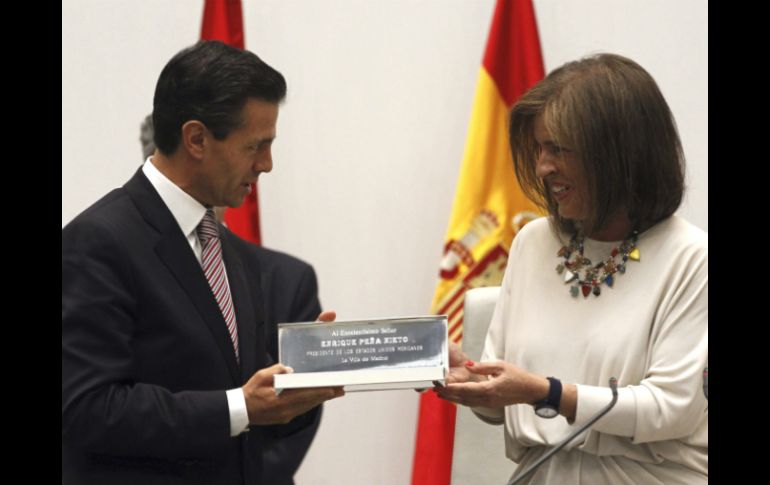 México | La alcaldesa distinguió al Presidente de México y destacó los vínculos entre países Peña Nieto recibe las Llaves de Oro de Madrid La alcaldesa Ana Botella distinguió al Presidente de México y destacó los vínculos entre países Por: EFE 9 de junio de 2014 - 11:17 hs MADRID, ESPAÑA (09/JUN/2014).- La alcaldesa de Madrid, Ana Botella, entregó hoy las Llaves de Oro de la ciudad al presidente de México, Enrique Peña Nieto, quien agradeció la "gran distinción" durante un acto enmarcado en la visita de Estado a España que empezó hoy lunes. En un discurso en el salón de plenos municipal, Botella destacó los vínculos de amistad históricos, lingüísticos, culturales y económicos tanto entre España y México como entre las capitales de ambos países. La alcaldesa de Madrid, que es la esposa del expresidente del Gobierno español José María Aznar, resaltó que México es un país "entrañablemente querido" por los españoles y, tras agradecer la visita de Peña Nieto, mostró su deseo de que esta contribuya a estrechar la colaboración entre ambos países "en un mundo crecientemente global". Subrayó la vocación iberoamericana de Madrid y el atractivo de México para las empresas españolas como "excelente socio" para sus negocios y aplaudió las reformas acometidas por Peña Nieto, al que deseó éxito en el futuro. El presidente de México destacó la relevancia cultural y la influencia de Madrid en España e Iberoamérica y anunciado que, por ello, México decidió iniciar en la plaza de Colón - una de las más conocidas de la capital española - el lanzamiento de una campaña de promoción turística en todo el mundo. Peña Nieto aseguró que la llave de oro que "generosamente" se le entregó hoy reafirma la "hermandad" y es símbolo del "prometedor futuro" que se abre para las sociedades de México y España. Antes del acto oficial en el Ayuntamiento de Madrid, un grupo de unas veinte personas ataviadas con carteles se concentró en las inmediaciones para protestar contra las políticas de Peña Nieto, al que calificaron de "asesino" a voz en grito cuando este ha llegado a la zona. Ya por la mañana un par de jóvenes intentaron interrumpir a voces un discurso del presidente ante un auditorio de empresarios, pero fueron rápidamente alejados por los servicios de seguridad. Temas Gobierno de México Giras presidenciales España Enrique Peña Nieto Presidentes Lee También ¿Dónde ver EN VIVO el partido amistoso México vs Colombia? Dónde ver EN VIVO el México vs Argentina por el Mundial Sub-20 Dólar amanece encarecido este 10 de octubre Pronóstico de lluvia hoy, 10 de octubre, a esta HORA en CDMX Recibe las últimas noticias en tu e-mail Todo lo que necesitas saber para comenzar tu día Registrarse implica aceptar los Términos y Condiciones