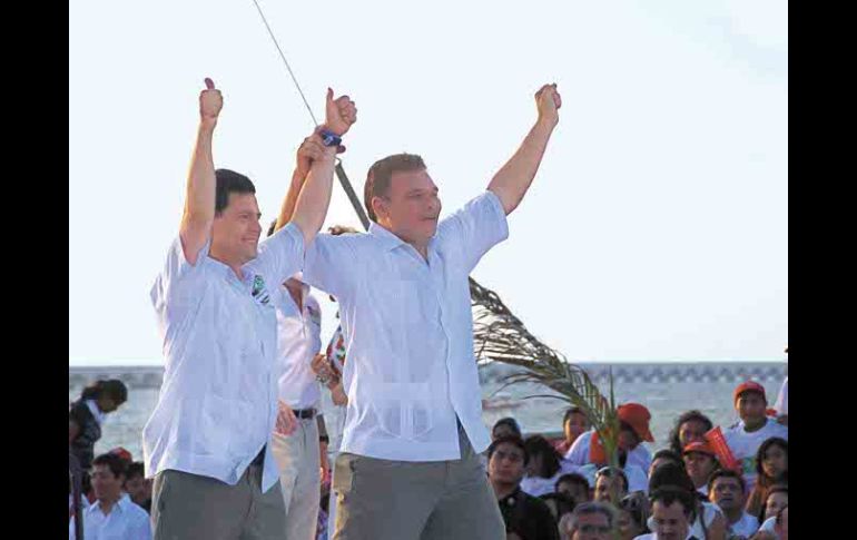 México | El show previo es amenizado por un dueto que lanza bombas yucatecas Peña Nieto reúne funcionarios estatales en Yucatán Unos 5 mil simpatizantes esperan ya al candidato que dará el banderazo de salida a la campaña de Rolando Zapata, quien busca la gubernatura del Estado por el PRI-PVEM Por: SUN 9 de abril de 2012 - 20:58 hs El candidato presidencial Enrique Peña Nieto, acompañó este lunes al abanderado Rolando Zapata Bello. EL UNIVERSAL / PROGRESO, YUCATÁN (09/ABR/2012).- Funcionarios estatales del gobierno de Yucatán se movilizaron para estar en el mitin que encabezará el candidato presidencial de la coalición Compromiso por México (PRI-PVEM), Enrique Peña Nieto. En el malecón del municipio de Progreso en Yucatán, unos 5 mil simpatizantes esperan ya al candidato que dará el banderazo de salida a la campaña de Rolando Zapata, quien busca la gubernatura del Estado por el PRI-PVEM. Al inicio del evento, la zona estaba custodiada por elementos de la policía estatal y municipal que han cerrado calles de la ciudad. El evento cuenta con la presencia de funcionarios estatales que se movilizaron desde la ciudad de Mérida. Se notó la presencia del secretario de Hacienda del Estado, Juan Ricalde; subsecretario de Gobierno y Asuntos Religiosos, Marcos González; el Director de la Junta de Agua Potable, Roberto Pinzón; el secretario de Cultura, Renán Guillermo. El secretario de Protocolo y Logística del Gobierno del Estado, Jorge Canul Rubio, es el encargado de dirigir el operativo para la llegada de Peña Nieto. El candidato presidencial arribará al lugar acompañado de la Gobernadora del Estado, la priísta Yvonne Ortega. El show previo es amenizado por un dueto que lanza "bombas yucatecas" (refranes humorísticos típicos de la región) en favor de Peña Nieto. Temas Enrique Peña Nieto PRI Yucatán Elecciones México 2012 Recibe las últimas noticias en tu e-mail Todo lo que necesitas saber para comenzar tu día Registrarse implica aceptar los Términos y Condiciones