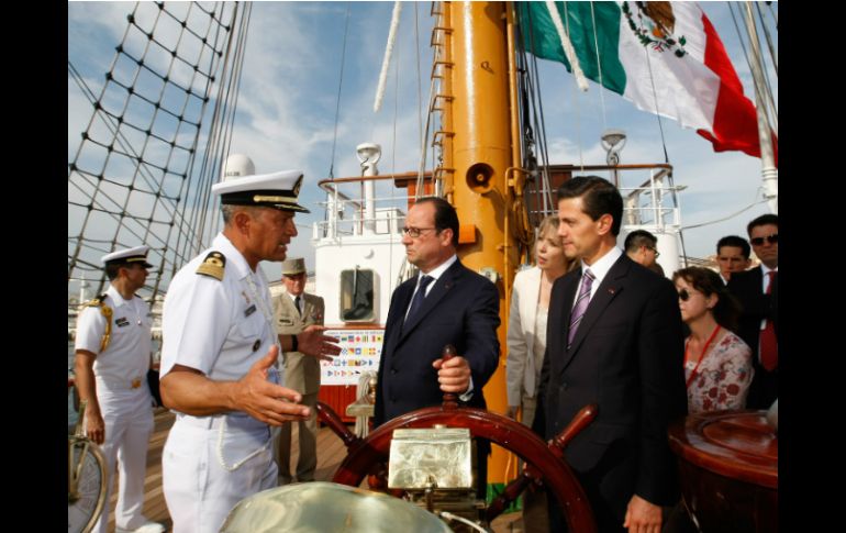 México | La embarcación se encuentra anclado en el puerto de Marsella Peña Nieto y Hollande visitan Buque Escuela Cuauhtémoc Acompañan al Presidente, los titulares de la Sedena, Semar, SHCP, Sectur y la Sener Por: SUN 15 de julio de 2015 - 13:14 hs MARSELLA, FRANCIA (15/JUL/2015).- Los presidentes de México, Enrique Peña Nieto, y de Francia, Francois Hollande, visitaron el Buque Escuela Cuauhtémoc, que se encuentra anclado en este puerto del Mediterráneo. Tras visitar la empresa Airbus, donde recorrió la cadena de producción de helicópteros Super Puma e hizo un recorrido, a bordo de una aeronave y acompañado por el presidente Hollande, sobre el Parque Nacional de las Calanques, el Presidente Peña visitó el navío mexicano. Tras descender en un helicóptero en el Puerto J4 del Puerto de Marsella, camino hacia el llamado "Caballero de los Mares" donde con solemnidad castrense, los cadetes de la Heroica Escuela Naval Militar lo recibieron. Acompañaron al Presidente Peña Nieto los secretarios de la Defensa Nacional, general Salvador Cienfuegos, de Marina-Armada de México, almirante francisco Vidal Soberón, de Hacienda, Luis Videgaray, de Turismo, Claudia Ruiz Massieu y de Economía, Ildefonso Guajardo, entre otros. El Presidente de México encabezó la ceremonia de Cancelación del Timbre Postal Gilberto Bosques 2015 para luego asistir a una cena que ofrece en su honor el presidente Hollande. Temas Gobierno de México Francia Giras presidenciales Enrique Peña Nieto François Hollande Lee También Día de Muertos 2025: ¿Dónde comprar papel picado en CDMX? México vs Corea del Sur: EN VIVO, dónde ver el partido por el Mundial Sub-17 femenil Desfile de Alebrijes Monumentales, ruta y hora del evento HOY en CDMX Así es como el minimalismo ha impactado en la cultura mexicana Recibe las últimas noticias en tu e-mail Todo lo que necesitas saber para comenzar tu día Registrarse implica aceptar los Términos y Condiciones