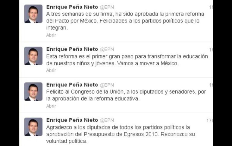 México | El Presidente manifiesta su beneplácito por la primera reforma del Pacto por México Peña felicita al Congreso por aprobar la reforma educativa El Mandatario celebra aval de la primera reforma del Pacto por México, a tres semanas de su firma Por: EL INFORMADOR 21 de diciembre de 2012 - 16:20 hs El Presidente felicita a los legisladores mediante una red social. ESPECIAL / CIUDAD DE MEXICO (21/DIC/2012).- El Presidente de México, Enrique Peña Nieto, manifestó su beneplácito ante la aprobación de la reforma educativa. Mediante su cuenta de Twitter, el Mandatario felicitó a diputados y senadores por el aval a la reforma, y manifestó ''Esta reforma es el primer gran paso para transformar la educación de nuestros niños y jóvenes. Vamos a mover a México.'' Peña celebra la aprobación de la primera reforma del Pacto por México, a tres semanas de su firma. La Cámara de Diputados aprobó hoy modificaciones que introdujo la Cámara de Senadores según las cuales un instituto de evaluación tendría que examinar no sólo a nuevos candidatos, sino a maestros que deseen continuar con empleos en escuelas públicas. Por tratarse de una reforma constitucional, se necesita que la aprueben 17 de los 31 congresos estatales antes de que sea promulgada. La propuesta establece dotar de autonomía a un instituto de evaluación de la educación y realizar un censo para conocer el número exacto de maestros, alumnos y escuelas que hay en el país, datos que hasta ahora no se tienen. Además, plantea extender las horas de clases en más de 40 mil escuelas públicas en México. Con información de AFP Temas Gobierno de México Enrique Peña Nieto Reforma Educativa Pacto por México Lee También El “Baile de las Rosas”, una velada con causa Cartucho Clima en Ciudad de México hoy: el pronóstico para el viernes 17 de octubre de 2025 Esto se sabe de la megamarcha de maestros en CDMX el 17 de octubre Recibe las últimas noticias en tu e-mail Todo lo que necesitas saber para comenzar tu día Registrarse implica aceptar los Términos y Condiciones