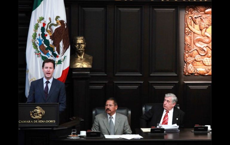 México | El viceprimer ministro de Gran Bretaña visita México Políticos deben acercar poder a ciudadanos, dice Nick Clegg El político presumió que su país discute una reforma política y que, incluso, buscan transformar el sistema electoral británico y avanzar en instrumentos de democracia participativa Por: SUN 29 de marzo de 2011 - 18:44 hs El viceprimer ministro de Gran Bretaña, Nicholas Clegg, durante la sesión solemne por su visita al Senado de la República. EL UNIVERSAL / CIUDAD DE MÉXICO (29/MAR/2011).- En el marco de la discusión de reforma política que discuten los senadores, el viceprimer ministro de Gran Bretaña, Nick Clegg, explicó en el Pleno de la Cámara Alta que los políticos están llamados a "adaptar nuestro sistema político" y acercar las instituciones y el poder a los ciudadanos. Nick Clegg consideró que es necesario "transformar las estructuras de gobernabilidad" para establecer nuevas alianzas abiertas y democráticas. El político presumió que su país discute una reforma política y que, incluso, en mayo se realizará un referéndum para transformar el sistema electoral británico y avanzar en instrumentos de democracia participativa que garanticen instituciones más representativas para los ciudadanos. Nick Clegg también detalló a los senadores que pactó con el gobierno de Felipe Calderón Hinojosa ofrecer ayuda para continuar con la lucha contra el crimen organizado. Senadores de PRI, PAN y PRD intentan destrabar los acuerdos para lograr por lo menos un dictamen de cinco puntos para reformar el sistema político mexicano. El dictamen no ha podido ser aprobado desde diciembre de 2009, cuando el Ejecutivo envió una iniciativa en la materia. Temas Gobierno de México Senado Gran Bretaña Recibe las últimas noticias en tu e-mail Todo lo que necesitas saber para comenzar tu día Registrarse implica aceptar los Términos y Condiciones