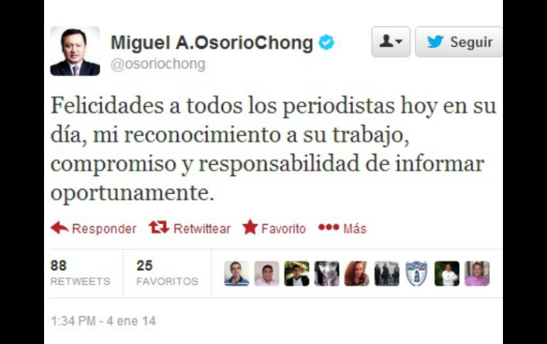 México | A través de las redes sociales mandan mensajes por el Día Nacional del Periodista Políticos y funcionarios felicitan a periodistas mexicanos A través de las redes sociales mandan mensajes por el Día Nacional del Periodista Por: NTX 4 de enero de 2014 - 15:50 hs El secretario de Gobernación fue uno de los funcionario que se sumaron a la felicitaciones para los periodistas. ESPECIAL / CIUDAD DE MÉXICO (04/ENE/2013).- Políticos, funcionarios, alcaldes e instituciones académicas felicitaron a los periodistas mexicanos, al celebrarse este sábado 4 de enero el Día Nacional del Periodista. En este marco, el secretario de Gobernación, Miguel Ángel Osorio Chong, escribió en su cuenta de Twitter: "Felicidades a todos los periodistas hoy en su día, mi reconocimiento a su trabajo, compromiso y responsabilidad de informar oportunamente". Por su parte, la Facultad de Ciencias Políticas y Sociales (FCPyS) de la Universidad Nacional Autónoma de México ( UNAM) publicó en su cuenta: "Gracias a todos aquellos que educan al pueblo informándolo". ¡Feliz día del periodista! El coordinador nacional de Protección Civil de la Secretaría de Gobernación, Luis Felipe Puente, redactó en su Twitter que: A todos los Periodistas les felicitamos y agradecemos su apoyo de siempre, para informar a la población, reconocemos su profesionalismo". Por otra parte, la directora del Consejo Nacional de Fomento Educativo (Conafe), Carolina Viggiano, escribió: "Reciban una afectuosa felicitación y reconocimiento por su valiosa labor de informar. Día del Periodista". En tanto, el ex gobernador de Guanajuato, Juan Manuel Oliva, recordó que "México celebra el día del periodista en honor a #ManuelCaballero y también redactó que "el periodismo es lo que mantiene la democracia". También el ex gobernador de Guerrero y actual senador priista René Juárez Cisneros publicó en su Twitter: "Hoy es el Día del Periodista en México. Felicidades y mi reconocimiento a las mujeres y hombres que ejercen esa noble y gran profesión". A su vez, la presidenta municipal de Monterrey, la panista Margarita Arellanes, escribió en su cuenta de Twitter: ¡Buenos días! Hoy es día del periodista en México. Felicidades a todos ellos por su trabajo y dedicación diaria". La celebración de este día obedece a que el periodista jalisciense Manuel Caballero, quien es considerado "el iniciador del reporterismo" en el país, falleció el 4 de enero de 1826 en el Distrito Federal. Cabe señalar que México tiene dos festejos relacionados con los comunicadores: el 7 de junio, Día de la Libertad de Expresión, y el 4 de enero, Día del Periodista. Temas Periodismo Política Twitter Recibe las últimas noticias en tu e-mail Todo lo que necesitas saber para comenzar tu día Registrarse implica aceptar los Términos y Condiciones