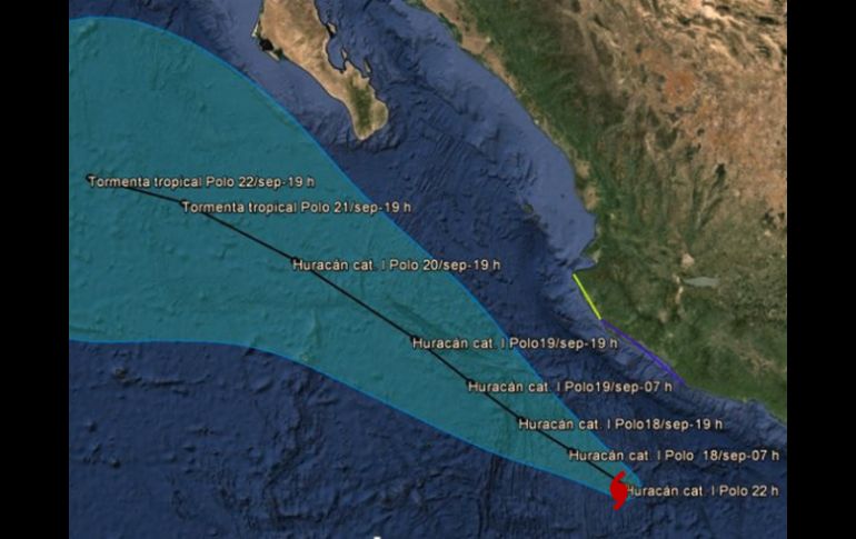 México | Se localiza a 290 kilómetros al sur de Manzanillo, Colima 'Polo' evoluciona a huracán categoría I Se localiza a 290 kilómetros al sur de Manzanillo, Colima Por: EL INFORMADOR 17 de septiembre de 2014 - 21:21 hs Vista de la previsión de la trayectoria del huracán 'Polo'. TWITTER @conagua_clima / CIUDAD DE MÉXICO (17/SEP/2014).- El fenómeno meteorológico 'Polo', localizado en el Pacífico Mexicano, evolucionó esta noche a huracán categoría I en la escala Saffir-Simpson, informó la Comisión Nacional del Agua ( Conagua). Por medio de su cuenta en Twitter, la Conagua dio a conocer que el huracán presenta vientos máximos sostenidos de 120 kilómetros por hora con rachas de hasta 150 kilómetros por hora y se desplaza al oeste-noroeste a 17 kilómetros por hora. 'Polo' se localiza a 355 kilómetros al sur oeste-suroeste de Zihuatanejo, Guerrero y a 290 kilómetros al sur de Manzanillo, Colima. El sistema favorecerá lluvias intensas (de 75 a 150 milímetros) en Jalisco y Colima; muy fuertes (de 25 a 50 milímetros) en Nayarit, Oaxaca, Guerrero y Michoacán, y fuertes (de 25 a 50 milímetros) en Puebla. Se establece una nueva zona de alerta desde Punta San Telmo, Michoacán, hasta Cabo Corrientes, Jalisco. Temas Conagua Estados Huracanes Clima Tormenta tropical Lee También Estos son los estados en alerta por posible propagación de dengue Despliegan operativo tras bloqueos en Chiapas ¿LLUVIA en GDL por la noche?, pronóstico del clima para hoy, 13 de octubre Suben termómetros en Guadalajara y se espanta la lluvia este martes Recibe las últimas noticias en tu e-mail Todo lo que necesitas saber para comenzar tu día Registrarse implica aceptar los Términos y Condiciones