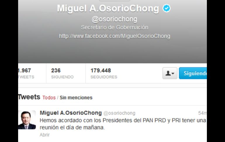 México | Dice que hay acuerdo para que el encuentro se realice el miércoles Posponen reunión del PAN, PRD y PRI con Osorio Chong Existe el acuerdo con dirigentes de los tres partidos para que el encuentro se lleve a cabo el miércoles, afirma Por: SUN 23 de abril de 2013 - 19:11 hs Osorio Chong da la información por medio de Twitter. ESPECIAL / CIUDAD DE MÉXICO (23/ABR/2013).- El secretario de Gobernación, Miguel Ángel Osorio Chong, anunció este martes que la reunión con los dirigentes del PAN, Gustavo Madero; PRD, Jesús Zambrano y del PRI, César Camacho Quiroz, se llevará a cabo el miércoles. A través de su cuenta de Twitter (@osoriochong), el funcionario federal subrayó que ya existe el acuerdo con los dirigentes de los tres partidos para que el encuentro se lleve a cabo el miércoles y no este martes como se había anunciado. "Hemos acordado con los presidentes del PAN, PRD y PRI tener una reunión el día de mañana", escribió Osorio Chong en la red social. El encargado de la política interna del país se reunirá con los líderes partidistas en el marco de la polémica desatada luego de que el PAN denunció intervención de autoridades federales y estatales en el proceso electoral de Veracruz. Ello puso ya en cuestión si el PAN y el PRD continúan en el Pacto por México. El dirigente nacional del PAN anunció que será hasta el lunes próximo cuando el Consejo Político de su partido se reúna y tomen una decisión sobre su actuar en el Pacto por México. Temas Segob Política Partidos políticos Miguel Ángel Osorio Chong Recibe las últimas noticias en tu e-mail Todo lo que necesitas saber para comenzar tu día Registrarse implica aceptar los Términos y Condiciones
