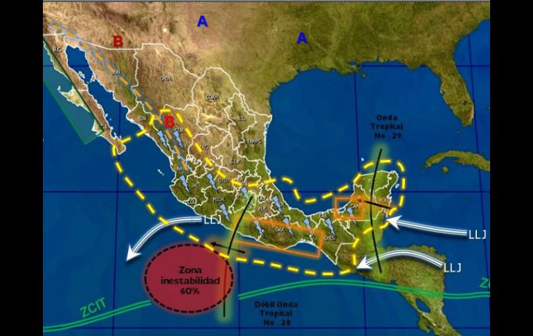 México | El sistema de inestabilidad evolucionaría a tormenta tropical en las próximas 48 horas Prevalece alto potencial ciclónico en el Pacífico El sistema de inestabilidad podría evolucionar a tormenta tropical en las próximas 48 horas Por: NTX 9 de septiembre de 2014 - 16:29 hs El sistema se localiza a 310 kilómetros al sur de Acapulco, Guerrero. TWITTER @conagua_clima / CIUDAD DE MÉXICO (09/SEP/2014).- En el Océano Pacífico la zona de inestabilidad mantiene 60 por ciento de probabilidad de evolucionar a ciclón tropical en las próximas 48 horas, informó el Servicio Meteorológico Nacional ( SMN). Según su más reciente reporte, el sistema se localiza a 310 kilómetros al sur de Acapulco, Guerrero, con vientos máximos sostenidos de 35 kilómetros por hora, rachas de hasta 45 y se desplaza lentamente hacia el noroeste. Detalló que en combinación con la Onda Tropical número 28, el meteoro ocasionará lluvias intensas en áreas de Chiapas, Oaxaca y Guerrero y mantendrá un fuerte aporte de humedad a los estados del sur del país. También se esperan precipitaciones muy fuertes acompañadas por tormentas en localidades de Michoacán, y fuertes en los estados de México, Morelos, Puebla, Querétaro, Hidalgo, Tlaxcala y el Distrito Federal. El SMN advirtió que debido a que las lluvias han sido constantes en algunas entidades, es posible que se genere reblandecimiento de suelo, por lo que pidió a la población extremar precauciones y mantenerse atenta a los llamados de Protección Civil y de las autoridades estatales y municipales. Agregó que en el Océano Pacífico esta tarde se formó una nueva zona de inestabilidad a mil 215 kilómetros al suroeste de Manzanillo, Colima, con vientos de 35 kilómetros por hora y rachas de hasta 45, lo que representa 10 por ciento de posibilidad de desarrollo ciclónico para las próximas 48 horas. Mientras tanto, en el Océano Atlántico también surgió una zona de inestabilidad que también presenta 10 por ciento de potencial de desarrollo ciclónico para las próximas 48 horas. El fenómeno se ubica a mil 230 kilómetros al este de las costas de Quintana Roo con vientos de 35 kilómetros por hora y rachas de hasta 45 kilómetros, y su trayectoria es a 16 kilómetros por hora hacia el oeste-noroeste. Temas Estados Clima Tormenta tropical SMN Lluvias en el país Recibe las últimas noticias en tu e-mail Todo lo que necesitas saber para comenzar tu día Registrarse implica aceptar los Términos y Condiciones