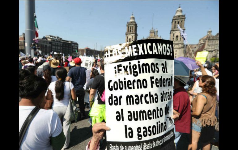 CIUDAD DE MÉXICO (23/ENE/2017).- Manifestantes de diversas organizaciones confluyeron en la Plaza de la Constitución, Zócalo, de la Ciudad de México para rechazar el aumento a los precios de las gasolinas, que entró en vigor con el Año Nuevo, mientras en Tampico, La Paz, en varios municipios de Chiapas, en Veracruz, Oaxaca, Sonora, Guerrero, Tamaulipas y Sinaloa se dieron manifestaciones por igual motivo.Varios miles de personas convergieron en la gran explanada capitalina y realizaron mítines por separado. No obstante, en las consignas de los manifestantes y los letreros que portaban la demanda era la misma: “¡Fuera Peña!”.Con letreros de diversos tamaños y materiales los inconformes protestaron contra el alza a los precios máximos de las gasolinas y el diésel, de entre 14% y 20%, previa a la liberalización prevista para marzo.En La Paz, Baja California Sur, en el mitin frente a Palacio de Gobierno, diversos oradores insistieron en el llamado a la Federación a dar marcha atrás al aumento a los combustibles y coincidieron en que a nivel local, el plan de austeridad anunciado hace unos días por el gobernador Carlos Mendoza Davis, “no es suficiente”.Mientras en Tamaulipas, en Ciudad Vicoria y Tampico, con mantas, gritando consignas y vestidos con ropa blanca, cientos de ciudadanos participaron en una marcha en contra del alza al precio de la gasolina.El movimiento Tamaulipas por la Paz organizó la protesta pacífica, que culminó en la Plaza de Armas, en la zona centro de Tampico.“La gallina de los huevos de oro no se murió... Se la comieron”, se leía en la manta que iba al frente del contingente, con otra frase: “No más gobiernos corruptos”.En la caminata no hubo incidentes, aunque sí vigilancia policiaca.EN DETALLEChiapas se une al descontentoPor segundo día consecutivo, docentes adheridos a la CNTE, estudiantes, ONG’s, y ciudadanos marcharon en Tuxtla Gutiérrez, Tapachula, Suchiate y Chilón, en protesta contra las reformas estructurales y el llamado gasolinazo.