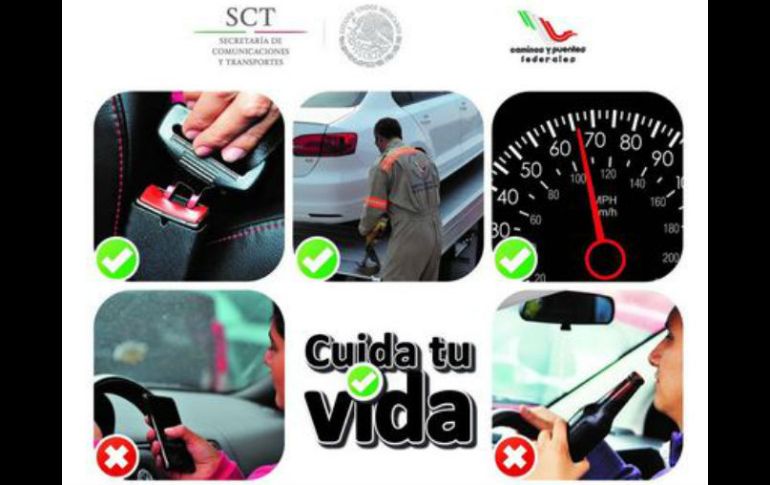 México | Caminos y puentes federales emite una serie de recomendaciones para la época decembrina Recomendaciones para viajar seguro por carretera Capufe implementa un operativo decembrino para concientizar a los conductores sobre seguridad vial Por: EL INFORMADOR 23 de diciembre de 2014 - 13:30 hs A través de su cuenta de Twitter, Capufe, envía alertas sobre las carreteras. TWITTER / @Capufe GUADALAJARA, JALISCO (23/DIC/2014).-Con el inicio de la época decembrina, cientos de familias deciden dejar la ciudad para viajar a distintos destinos turísticos de la república, por eso, caminos y puentes federales (CAPUFE) ha emitido a través de sus redes sociales algunas recomendaciones para viajar sin contratiempos. 1.-Verifica el estado de tu vehículo antes de salir a carretera, así como la presión de las llantas y recuerda llevar llanta de refacción y señales de emergencia. 2-No manejes cansado ni bajo los efectos de bebidas alcohólicas o de medicamentos que produzcan somnolencia. 3.-Todos los ocupantes del automóvil deben utilizar el cinturón de seguridad mientras que, los bebés, deberán ir en una silla especial en la parte trasera. 4.-Evita llevar bultos y objetos que obstruyan la visibilidad en el vehículo al momento del tránsito. 5.-No utilices el teléfono celular al momento de estar manejando. 6.-Respeta a los otros automovilistas así como el límite de velocidad en las distintas vías. 7.-Los turistas pueden solicitar asistencia vial a CAPUFE así como asistencia médica de forma gratuita en el teléfono 074. 8.-Mantente al tanto de las redes sociales de caminos y puentes federales @Capufe. EL INFORMADOR/ PATRICIA GALLARDO Temas Capufe Carreteras Periodo vacacional Lee También Bosque de maple en Jalisco, el otoño más espectacular de México está aquí Reportan carambola en autopista a Morelia Cierran temporalmente carretera México-Nogales por enfrentamiento Tres personas resultan lesionadas tras explosión de camión en carretera México-Puebla Recibe las últimas noticias en tu e-mail Todo lo que necesitas saber para comenzar tu día Registrarse implica aceptar los Términos y Condiciones