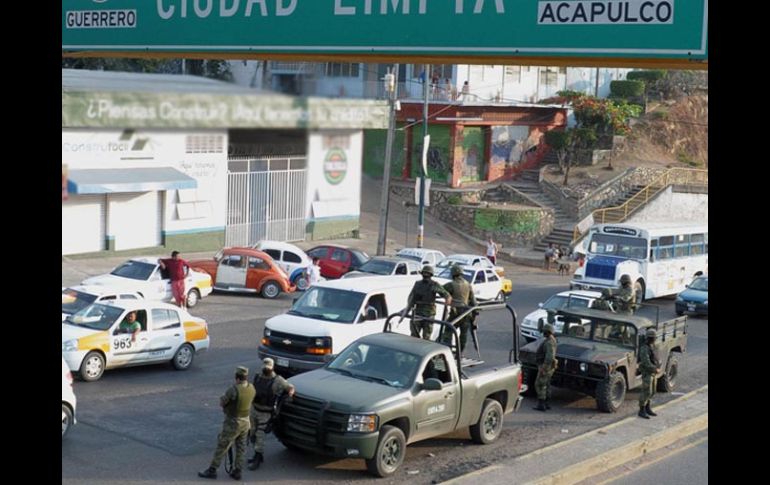 México | Militares instalan retenes en varias colonias tras las 28 ejecuciones del sábado Refuerzan seguridad en Acapulco Corporaciones de los tres niveles de gobierno mantienen vigilancia en las entradas y salidas del puerto Por: SUN 9 de enero de 2011 - 20:39 hs Militares acuden a la escena de un crimen registrado hoy en Acapulco. AP / ACAPULCO, GUERRERO (09/ENE/2011).- Este domingo, autoridades de los tres niveles de Gobierno acordaron reforzar la seguridad con elementos de la Marina y el Ejército, así como implementar un grupo estratégico de reacción inmediata de policías federales que arribaron al puerto luego de las 28 ejecuciones que se registraron el sábado. En colonias de Acapulco como Emiliano Zapata, Ciudad Renacimiento, Las Cruces y poblados como Llano Largo se pudo observar la presencia de elementos del Ejército Mexicano, así como de la Marina, que instalaron retenes por espacio de media hora y revisaron vehículos. No obstante, cuatro personas fueron ejecutadas en el municipio y tres más en diferentes regiones de Guerrero. El secretario de Seguridad Pública en el estado, Heriberto Salinas Altés, dijo que corporaciones de los tres niveles de gobierno mantienen vigilancia en las entradas y salidas del puerto. Durante el este domingo, helicópteros de la Marina y de la Policía Estatal sobrevolaron por el puerto de Acapulco. Temas Crimen Organizado Guerrero Acapulco Recibe las últimas noticias en tu e-mail Todo lo que necesitas saber para comenzar tu día Registrarse implica aceptar los Términos y Condiciones