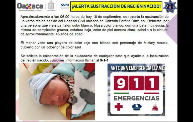 GUADALAJARA, JALISCO (18/SEP/2017).- Un bebé recién nacido fue sustraído a las 06:00 horas de este lunes del Hospital Civil Dr. Aurelio Valdivieso de Oaxaca, por lo que las autoridades han levantado alertas de emergencia.La madre del menor aseguró que una mujer vestida de enfermera fue quien se llevó al menor "para realizarle estudios" pero no regresó. Según la descripción la mujer que sustrajo al menor tiene aproximadamente 45 años, de estatura baja, piel morena clara, cabello a la cintura y complexión gruesa, y vestía blusa y pantalón blancos con una bata muy sucia.El bebé robado usaba una playera rojo con blanco con dibujos de Mickey Mouse y estaba envuelto en un cobertor azul.El hospital permanece cerrado mientras se realiza la búsqueda del menor en las instalaciones. Además corporaciones de seguridad realizan un operativo de búsqueda.En redes sociales circula una imagen que al parecer fue tomada de las cámaras de seguridad del hospital, en las que se observa a la mujer vestida de enfermera salir con el bebé en brazos.