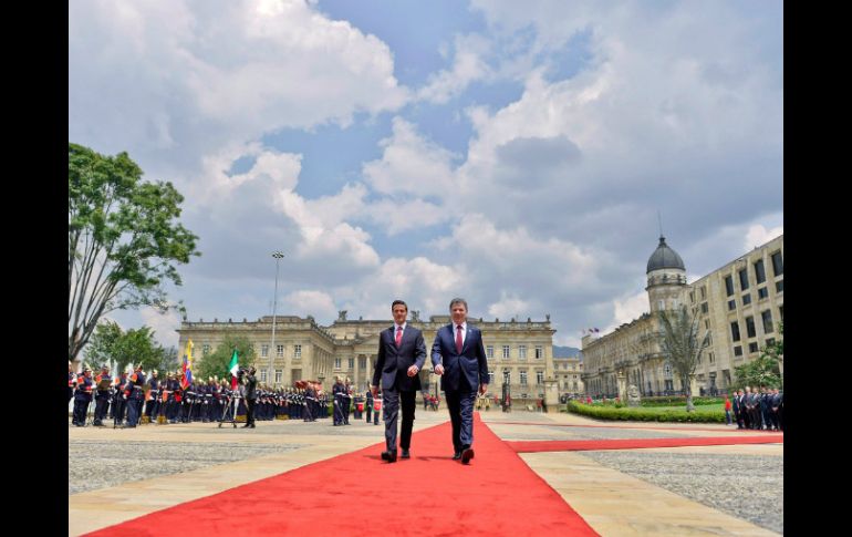 BOGOTÁ, COLOMBIA (27/OCT/2016).- Al iniciar la visita de Estado que realiza a Colombia, el Presidente Enrique Peña Nieto fue recibido este jueves con honores militares por el presidente Juan Manuel Santos en el Palacio Presidencial Casa de Nariño.Peña Nieto, acompañado por la primera dama Angélica Rivera, fue recibido en la Plaza de Armas de la sede del Poder Ejecutivo de Colombia por Santos Calderón y su esposa María Rodríguez Múnera.De acuerdo con el protocolo se entonaron los himnos nacionales, primero el de México y enseguida el de Colombia, se realizó la presentación de comitivas, la mexicana encabezada por la canciller Claudia Ruiz Massieu y el secretario de Economía, Ildefonso Guajardo. Los mandatarios pasaron revista a la guardia honor.En estos momentos Peña Nieto y Santos Calderón trabajan en privado y al concluir atestiguarán la firma de una serie de acuerdos de cooperación México-Colombia para después ofrecer un mensaje a medios. Habrá una comida en honor del Presidente mexicano.Pese a que es el encuentro número 30 entre ambos mandatarios, es la primera visita de Estado que realiza Peña Nieto a Colombia en reciprocidad a la que realizó Santos Calderón a a México.Al concluir las actividades en Casa de Nariño, el Presidente Peña visitará la sede del Congreso de Colombia donde se reunirá con los presidentes del Senado y de la Cámara de Representantes, recibirá las llaves de la ciudad y se reunirá con la presidenta de la Corte Suprema de Justicia.Por la noche viajará a Cartagena de Indias donde participará en la edición XXV de la Cumbre Iberoamericana.