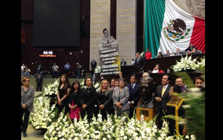 México | Luego de reanudar la sesión, perredistas colocan un busto de Lázaro Cárdenas con flores Simulan 'funeral' de CFE y Pemex en tribuna de San Lázaro Luego de reanudar la sesión, diputados perredistas colocan un busto de Lázaro Cárdenas, con flores Por: SUN 1 de agosto de 2014 - 13:48 hs Este ''funeral'' fue anunciado por la vicepresidenta de la mesa directiva, la perredista Aleida Alavez. Foto: @ALEIDAALAVEZ. ESPECIAL / CIUDAD DE MÉXICO (01/AGO/2014).- Minutos después de que se reanudara la sesión en la Cámara de Diputados, luego de que fuera tomada la tribuna por legisladores de izquierda, la fracción parlamentaria del Partido de la Revolución Democrática ( PRD) colocó en el pleno un busto del general Lázaro Cárdenas, junto con decenas de arreglos florales. Aproximadamente 40 diputados, entre ellos Alfa González, José Luis Muñoz Soria, Miguel Alonso Raya, Guillermo Sánchez y Roberto López, montaron una guardia alrededor del busto y las flores. Este “funeral” fue anunciado por la vicepresidenta de la mesa directiva, la perredista Aleida Alavez desde la tribuna, pues mientras dictaba su posición en contra de la reforma energética dijo que sería el funeral de Petróleos Mexicanos y la Comisión Federal de Electricidad. Temas Reforma Energética PRD Poder Legislativo Cámara de Diputados Lee También Otorgan más facultades al SAT contra evasores de impuestos; expertos critican reforma recaudatoria Gaby Cárdenas va por un Congreso que sea cercano Cobro de impuestos saca a flote al Gobierno federal Cámara de Diputados aprueba en lo general la Ley de Ingresos 2026 Recibe las últimas noticias en tu e-mail Todo lo que necesitas saber para comenzar tu día Registrarse implica aceptar los Términos y Condiciones