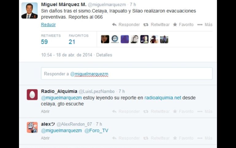 México | Se realizaron evacuaciones en edificios de diferentes municipios Sin daños en Guanajuato tras sismo Se realizaron evacuaciones en edificios de los municipios de Celaya, León, Irapuato y Salamanca Por: SUN 18 de abril de 2014 - 17:10 hs El mandatario guanajuatense, Miguel Márquez Márquez, comunicó lo sucesido en su cuenta deTwitter: @miguelmarquezm. ESPECIAL / GUANAJUATO, GUANAJUATO (18/ABR/2014).- El sismo registrado esta mañana se sintió en 22 municipios del estado de Guanajuato "sin daños" que reportar, informaron el gobernador del estado Miguel Márquez Márquez y la Unidad estatal de Protección Civil. Como consecuencia del movimiento telúrico de este Viernes Santo se realizaron evacuaciones en edificios de los municipios de Celaya, León, Irapuato y Salamanca, en los que se percibió con mayor intensidad. En los 22 municipios diversas corporaciones de seguridad revisaron edificios, hospitales, escuelas y guarderías, así como las redes de electricidad, agua, vialidades, árboles, espectaculares, semáforos y postes. En Irapuato el personal de Protección Civil verifica inmuebles de la zona industrial que presentan algunas grietas. "Sin daños tras el sismo, Celaya, Irapuato y Silao realizaron evacuaciones preventivas" escribió el mandatario guanajuatense en su cuenta de Twitter. En León, clientes y personal salieron de los edificios de la Plaza Stadium -a un costado del Estadio León- y de Financiera Independencia, ambos ubicados sobre el bulevar Adolfo López Mateos, informó el director municipal de Protección Civil, Crescencio Sánchez Abundiz. Por su parte, el director de Protección Civil de Irapuato, Javier Gallaga Solórzano, afirmó que hasta el momento las afectaciones no van más allá de grietas o cuarteaduras en algunas edificaciones de empresas, localizadas en el sector de la Ciudad Industrial y del fraccionamiento San José. Comentó que en la estancia Infantil "Girasol" el personal evacuó a los niños a su cargo, sin incidentes que lamentar. La Coordinación Ejecutiva de Protección Civil del estado recibió el reporte de la Unidades de Protección Civil de 22 municipios que sintieron los efectos de sismo, sin que hasta el momento se registraran daños, heridos o víctimas, informó el un comunicado la Secretaría de Seguridad Pública del estado. Los municipios son: Acámbaro, Apaseo el Alto, Apaseo el Grande, Celaya, Comonfort, Coroneo, Cortázar, Cuerámaro, Dolores Hidalgo, Irapuato, León, Moroleón, Pénjamo, Purísima del Rincón, Salamanca, San José Iturbide, San Miguel de Allende, Silao, Tarandacuao, Uriangato, Valle de Santiago y Villagrán. La dependencia señaló que se mantendrán atentos de manera preventiva. Temas Sismos nacional Estados Guanajuato SSN Recibe las últimas noticias en tu e-mail Todo lo que necesitas saber para comenzar tu día Registrarse implica aceptar los Términos y Condiciones