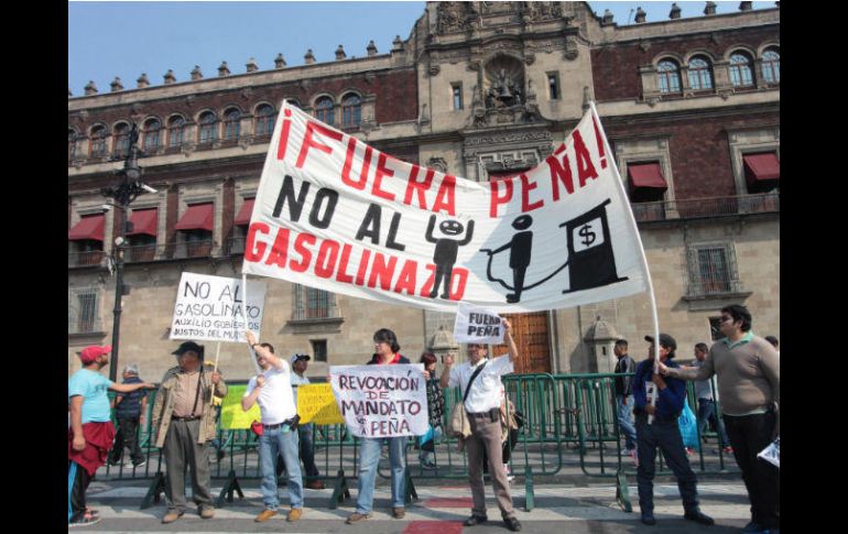 CIUDAD DE MÉXICO (07/ENE/2016).- Con el grito de "¡Únanse!", los manifestantes que salieron del Ángel de la Independencia llegan al Zócalo capitalino donde se espera que realicen un mitin encabezado por el padre Alejandro Solalinde.Alrededor de las 15:00 horas cerca de mil 200 manifestantes -de acuerdo con lo que señalaron monitores de la Secretaría de Gobierno de la Ciudad de México- se concentran alrededor del templete donde se llevará a cabo un mitin en contra del incremento en el precio de las gasolinas.Entre las consignas que gritan los manifestantes está la de que "País petrolero y el pueblo sin dinero", "Sigue tu salud y dejarán que te mueras" e incluso hay mantas en inglés que piden "Justicia del pueblo para quienes firmaron el Pacto por México".Sobre avenida Juárez aún avanza el contingente del Frente Popular Francisco Villa (FPFV), que también salió del Ángel de la Independencia, para sumarse a la protesta por el aumento en el precio de las gasolinas.