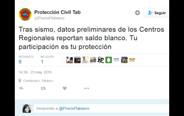 México | Protección Civil informa que los 17 municipios no registraron daños por el temblor Tabasco reporta saldo blanco tras sismo de 5.4 grados Protección Civil informa que los 17 municipios no registraron daños por el movimiento telúrico, con epicentro en Cintalapa Por: NTX 23 de mayo de 2016 - 15:21 hs Protección Civil informó a través de su cuenta de Twitter. TWITTER / @ProcivilTabasco VILLAHERMOSA, TABASCO (23/MAY/2016).- El Instituto de Protección Civil (IPC) de Tabasco reportó saldo blanco tras recabar datos preliminares en sus centros regionales por el sismo que se percibió esta tarde en la entidad, con epicentro al oeste de Cintalapa, Chiapas. A través de su cuenta de Twitter @ProcivilTabasco, expuso que tras la percepción del movimiento telúrico en el estado, se aplicó el protocolo de emergencia. Mencionó que mediante los centros regionales de Sierra, Costa, Frontera Sur y Sabana, se monitorearon los 17 municipios que resultaron con un saldo blanco. De acuerdo con el Servicio Sismológico Nacional (SSN), el sismo se registró a las 14:20 horas y fue de 5.4 grados en la escala de Richter, con epicentro localizado a 34 kilómetros al Oeste de Cintalapa, Chiapas. Temas Tabasco Sismos nacional Chiapas Estados Lee También Pueblos Mágicos con tradiciones del Día de Muertos más cerca de Jalisco ¿Recibiste correo de rechazo de FIFA? Aquí te decimos cuándo es la siguiente venta SAT: ¿Qué pasa con el paro de trabajadores hoy 16 de octubre? Trump se reunirá con Putin para negociar fin de la guerra en Ucrania Recibe las últimas noticias en tu e-mail Todo lo que necesitas saber para comenzar tu día Registrarse implica aceptar los Términos y Condiciones