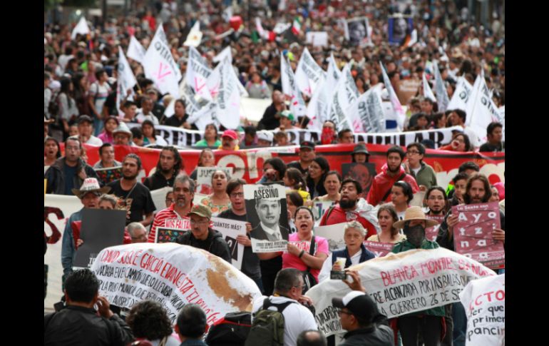 CIUDAD DE MÉXICO (26/SEP/2016).- En el Zócalo capitalino se realizó un mitin, encabezado por los padres de los 43 normalistas de Ayotzinapa desaparecidos en Iguala hace dos años.El contingente salió del Ángel de la Independencia a las 16:00 horas.La Secretaría de Seguridad Pública capitalina informó que en el Centro Histórico las vialidades se encuentran abiertas del Eje Central hasta la calle de Palma. Sólo permanecen cierres en la plancha del Zócalo.La marcha, encabezada por padres de los 43 estudiantes desaparecidos en Iguala, realizó su recorrido sobre todos los carriles centrales de Paseo de la Reforma.En la esquina de Reforma y Bucareli tres madres de estudiantes desaparecidos realizaron el pase de lista al pie del antimonumento con el número 43.Las mujeres dedicaron un mensaje a sus hijos."Los amamos, los queremos y los seguiremos buscando", dijo una de ellas.El avance continuó sobre avenida Juárez y después los manifestantes tomaron Eje Central para ingresar sobre la calle 5 de Mayo."Ayotzinapa vive, la lucha sigue", "No has muerto camarada, tu muerte será vengada", gritaban los manifestantes.A la marcha se sumaron estudiantes de la UNAM, el IPN y la UAM.Colectivos y organizaciones civiles acompañaron a los padres en la marcha, entre ellos destacó el Frente 19 de junio Nochixtlán y un contingente de integrantes de la CNTE.Cifras extraoficiales señalan que al menos 10 mil personas marcharon.