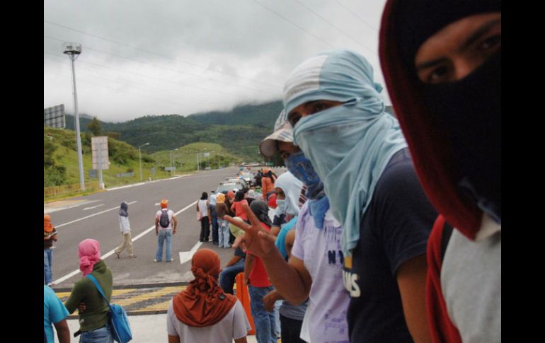 México | Normalistas protestan por la exigencia de que aparezcan los 43 desaparecidos con vida Toman nuevamente la caseta de Palo Blanco Normalistas protestan por la exigencia de que aparezcan los 43 estudiantes desaparecidos con vida Por: SUN 17 de noviembre de 2014 - 13:18 hs La manifestación es pacífica, las plumas de cobro son retiradas por los manifestantes normalistas. NTX / ARCHIVO CHILPANCINGO, GUERRERO (17/NOV/2014) .- Normalistas de varias escuelas rurales del país y maestros de la Coordinadora Estatal de Trabajadores de la Educación de Guerrero (CETEG) tomaron la caseta de Palo Blanco como parte de sus acciones para exigir la presentación con vida de los 43 normalistas de Ayotzinapa. Aunque esta actividad es recurrente entre las acciones que realizan las organizaciones adheridas a la Asamblea Nacional Popular (ANP), los normalistas aseguraron que es necesario seguir repartiendo información sobre los desaparecidos hasta encontrarlos. Los inconformes regalan algunos volantes con información sobre los hechos y la situación de los desaparecidos por el caso Iguala, a casi dos meses de los hechos violentos, y solicitan cooperaciones voluntarias a los automovilistas para continuar costeando su movimiento. La manifestación es pacífica, pero desde hace varias semanas, las plumas de los módulos de cobro fueron retiradas por maestros disidentes y normalistas para que la gente no pague el peaje. Temas Estados Carreteras Guerrero Manifestaciones en México Desapariciones y denuncias Recibe las últimas noticias en tu e-mail Todo lo que necesitas saber para comenzar tu día Registrarse implica aceptar los Términos y Condiciones