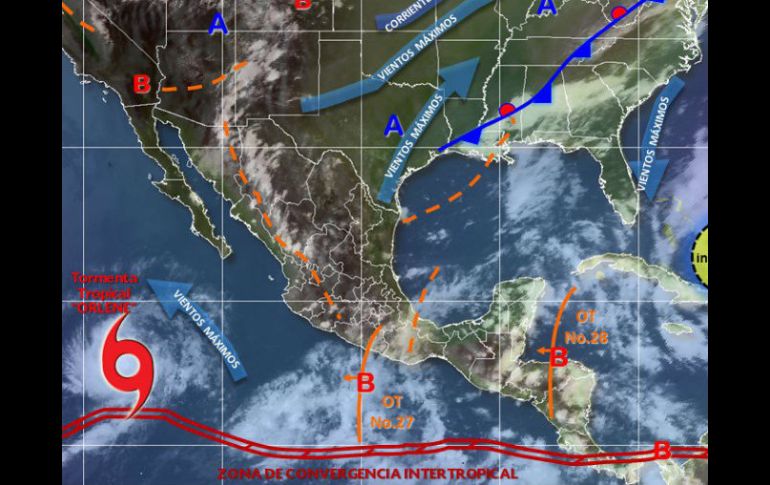CIUDAD DE MÉXICO (11/SEP/2016).- La tormenta tropical “Orlene” que se formó la madrugada de este domingo en el Océano Pacífico, se desplaza hacia el noroeste a 22 kilómetros por hora, con rachas de hasta 95 kilómetros por hora, sin afectar al país, informó el Servicio Meteorológico Nacional. El organismo de la Comisión Nacional del Agua (Conagua) reportó que el sistema se desarrolló a partir de la depresión tropical 16-E y actualmente se localiza aproximadamente a mil 728 kilómetros al oeste-suroeste de Cabo San Lucas, Baja California Sur. En tanto, a las 07:00 horas tiempo local, una zona de baja presión en el Océano Atlántico, asociada con una onda tropical al este de las Antillas Menores, con 70 por ciento de potencial ciclónico, se ubicó aproximadamente a cuatro mil 265 kilómetros al este de las costas de Quintana Roo. Este sistema, que por el momento no afecta al país, se desplaza hacia el oeste-noroeste a 18 kilómetros por hora, con vientos máximos sostenidos de 35 kilómetros y rachas de hasta 45 kilómetros por hora, detalló el Meteorológico en un comunicado. Por otra parte, refirió que en las próximas horas un canal de baja presión en el sureste de México originará tormentas muy fuertes en zonas de Oaxaca, Chiapas, Veracruz, Campeche y Quintana Roo, así como tormentas fuertes en áreas de Tabasco y Yucatán. Mientras que en el noroeste, el occidente y el centro del país, otro canal de baja presión en combinación con la entrada de humedad del Océano Pacífico y el Golfo de México, favorecerá tormentas fuertes en Sonora, Chihuahua, Durango, Sinaloa y Nayarit. Además de lluvias con intervalos de chubascos en los estados de Jalisco, Colima, Michoacán, Estado de México, Ciudad de México, Morelos y Puebla, y lluvias escasas o lloviznas en Baja California Sur, Zacatecas, San Luis Potosí, Hidalgo y Tlaxcala. Ante este panorama, se pide a la población extremar precauciones y mantenerse atenta a los avisos de Protección Civil y de las autoridades estatales y municipales. Ello debido a que podría reblandecerse el suelo en algunos sitios y ocasionar deslaves, deslizamientos de laderas, desbordamiento de ríos y arroyos o afectaciones en caminos y tramos carreteros, así como inundaciones en zonas bajas y saturación de drenajes en sitios urbanos.