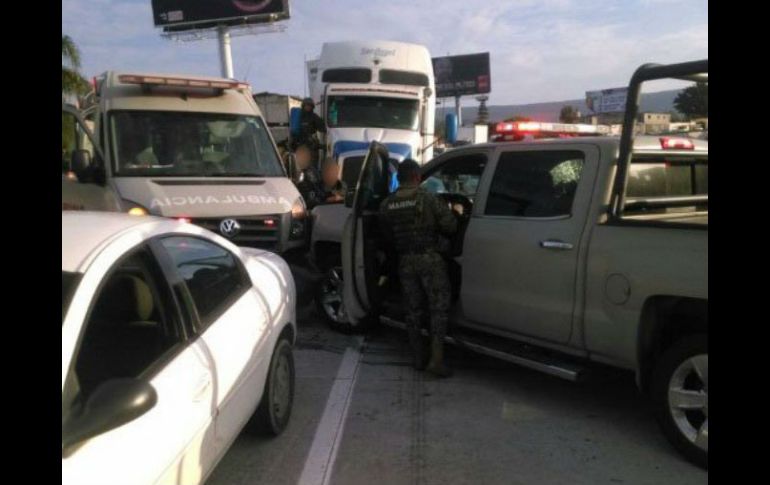 CUERNAVACA, MORELOS (25/AGO/2016).- Dos vehículos de la Marina, así como otros tres automotores particulares, fueron impactados por un tráiler en el libramiento de la autopista Cuernavaca-Acapulco; dos oficiales resultaron heridos en el percance.El accidente se registró a la altura del puente del centro comercial Galerías, sobre el tramo donde se construye el Paso Exprés, sobre el kilómetro 87 con dirección a Acapulco.Las unidades oficiales impactadas son una camioneta con el número económico 4392 y la ambulancia 3240.Los vehículos particulares fueron un Aveo color gris placas 461XTL, un neón color blanco placas 219RBA, así como un Pontiac color azul placas 423RSE, los tres del DF, todos ellos resultaron con daños.El tráiler pertenece a la empresa de Autotransportes San Ángel con placas federales de circulación 122DH2, el cual transportaba teja.Elementos de rescate de la Cruz Roja acudieron al auxilio de los lesionados sin que se conozca su estado de salud ni las causas del percance.Tan sólo este año se han registrado al menos 11 accidentes graves en esta vialidad, y es el segundo donde resultan involucrados vehículos oficiales. A finales del mes pasado patrullas del Ejército se vieron involucradas en un choque con un saldo de siete lesionados.