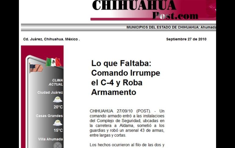 México | Detienen a posible autor del ataque con coche-bomba Tras exhibir robo matan a periodista en ciudad Juárez Rafael Armando Muro fue asesinado luego de denunciar en el ‘‘Chihuahua Post’’ el hurto de armas a la Policía estatal Por: EL INFORMADOR 28 de septiembre de 2010 - 01:51 hs En el “Chihuahua Post” el editor Rafael Armando Muro, divulga la noticia del robo de armas a las instalaciones de la Policía. ESPECIAL / CIUDAD DE MÉXICO (28/SEP/2010).- El periodista de Chihuahua, Rafael Armando Muro, de 60 años, fue asesinado en un autolavado, ubicado en las calles de Tecnológico y Centeno, en Ciudad Juárez. Según información de Radio Fórmula, un grupo de sujetos armados le disparó a Muro, quien unas horas antes difundió en su página de internet la noticia del robo de armas y equipo táctico al C-4 de la Policía estatal. Los asesinos del editor del diario en línea “Chihuahuapost.com” se dieron a la fuga. De acuerdo con la nota del diario, un comando armado entró a las instalaciones del complejo de la Secretaría de Seguridad Pública estatal alrededor de las 02:30 horas del lunes, sometieron a los guardias y robaron un arsenal de más de 60 armas largas y cortas. El editor publicó en la nota “Lo que faltaba: comando irrumpe el C-4 y roba armamento”, datos de autos, características del robo, el procedimiento del mismo, entre otra información, aunque nunca divulgó que los prófugos vistieran con uniformes de la corporación. Otras versiones, no oficiales, indican que alrededor de las 02:30 horas del lunes al menos ocho hombres llegaron al sitio, ubicado a tres kilómetros de la ciudad por la autopista a Aldama, pasaron por la caseta de vigilancia a bordo de una camioneta Dodge Ram, color blanco, como las que usan los agentes de la Cipol (Policía Estatal) e ingresaron hasta los cubículos del radio operador, y tras amagarlo saquearon las oficinas en las que se almacenan las armas de cargo de la Policía Estatal. La dependencia confirmó la irrupción a su centro de mando, sin embargo, no precisó la cantidad de rifles y pistolas que fueron sustraídos de la armería. Tras amagar al personal de guardia saquearon las oficinas en las que se almacenan las armas de cargo de la Policía Estatal. Se desconoce si se llevaron documentos o computadoras con información oficial. Las instalaciones, conocidas como C4, fueron resguardadas por la Policía Federal. Todo el personal que se hallaba en el inmueble fue puesto a disposición de la Procuraduría de Justicia para que rinda declaración. TELÓN DE FONDOSilenciados En los últimos 10 años han matado a 15 periodistas en Chihuahua. El 28 de abril de 2000, el reportero de “Radionet”, José Ramírez Puente fue asesinado. Casi un año después, José Luis Ortega Mata, director del “Semanario de Ojinaga”, cayó abatido por las balas el 19 de febrero de 2001. Casi un mes después (9 de marzo de 2001), hallaron muerto a José Barbosa Bejarano, corresponsal de la revista “Alarma”; Enrique Perea Quintanilla, director de la revista “Dos caras, una verdad”, fue ejecutado el 9 de agosto de 2006; Gerardo Guevara Domínguez, del “Semanario Siglo XXI”, asesinado el 11 de marzo de 2007 y Saúl Noé Martínez, encontrado muerto el 23 de abril de 2007. De igual manera, a Candelario Pérez Pérez, editor de la revista “Sucesos” lo encontraron muerto el 23 de junio de 2008. De “El Diario” de Juárez han sido abatidos tres periodistas: David García Monroy el 11 de octubre de 2008; José Armando Rodríguez Carreño, “El Choco” el 13 de noviembre de 2008 y Luis Carlos Santiago Orozco el 16 de septiembre pasado. Ernesto Montañez Valdivia, editor de la Revista “Enfoque”, asesinado el 14 de julio de 2009. A Jaime Omar Gándara lo mataron el 20 de septiembre del mismo año; Norberto Miranda Madrid, director del medio digital “Radio Visión”, asesinado el 23 de septiembre de 2009. Así como Guillermo Alcaraz, periodista de la agencia “Omnia” lo mataron el pasado 10 de julio y con la ejecución de ayer de Rafael Armando Muro, suman los 15 profesionales que han perdido la vida ejerciendo su labor periodística. Detienen a posible autor del ataque con coche-bomba La Secretaría de Seguridad Pública (SSP) presentó a José Iván Contreras Lumbreras, alias “El Keiko” quien participara, presuntamente, en el ataque con coche-bomba a policías federales el pasado 15 de julio en Ciudad Juárez Chihuahua, en el que perdieron la vida dos elementos de seguridad y un rescatista. De acuerdo con la SSP, el ataque fue perpetrado en respuesta a la detención de Armando Acosta Hernández, “El 35”, quien controlaba el sector Aldama de esa localidad fronteriza al servicio de la organización criminal “La Línea”, brazo armado del cártel de Juárez. Contreras Lumbreras se habría encargado de supervisar la colocación del vehículo con explosivos en la Avenida 16 de Septiembre y Bolívar, minutos antes de la explosión. Junto a este sujeto fueron detenidas cinco personas identificadas como Jaime Arturo Chávez González, alias “El Jimmy”; Jesús David Grado Morales, “El Negro”; Blas “N”; Diana “N” y Héctor Horacio Medina Vital, “El Héctor”. Temas Crimen Organizado Ciudad Juárez SSP Periodistas asesinados Lee También Clima en Ciudad de México hoy: el pronóstico para el lunes 13 de octubre de 2025 Pequeñas grandes aventuras en las Fiestas de Octubre Detienen en Tabasco a menor vinculado con grupo delictivo Hoy No Circula lunes 13 de octubre 2025: Autos que descansan en CDMX y Edomex Recibe las últimas noticias en tu e-mail Todo lo que necesitas saber para comenzar tu día Registrarse implica aceptar los Términos y Condiciones