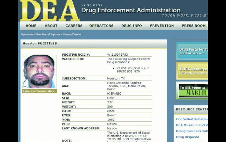 México | Ramírez Treviño rendirá declaración ante el agente del Ministerio Público federal Trasladan al ''X-20'' al DF Ramírez Treviño rendirá declaración ante el agente del Ministerio Público federal Por: EL INFORMADOR 17 de agosto de 2013 - 23:35 hs a Agencia antidrogas de Estados Unidos ofrecía una recompensa de cinco millones por la captura de Mario Ramírez Treviño. ESPECIAL / CIUDAD DE MÉXICO (18/AGO/2013).- El Gobierno federal confirmó que Mario Armando Ramírez Treviño, alias el “X-20”, fue trasladado a la Ciudad de México para rendir su declaración. En el año 2000, Ramírez Treviño trabajaba como un hombre cercano a Jaime González Durán (alias “El Hummer”), uno de los fundadores de Los Zetas. El “X-20” se mantuvo en las filas del cártel del Golfo cuando Los Zetas decidieron formar su propio cártel. Se puso al mando de Samuel Flores Borrego, “El Metro 3”, y trabajó como el segundo del cártel en Reynosa, Tamaulipas. Tras una aparente traición dentro de la organización, Flores Borrego fue asesinado en septiembre de 2011 y Ramírez Treviño retomó su lugar en Reynosa. Con la muerte de su jefe, varios integrantes dentro del cártel del Golfo se declararon la guerra. Para finales del 2012, las Fuerzas Armadas arrestaron a Mario Cárdenas Guillén y a Jorge Eduardo Costilla Sánchez, dos de los líderes más poderosos del cártel en su momento. Tras sus ausencias, Ramírez Treviño mandó asesinar a “El Metro 4”, Miguel “El Gringo” Villarreal, y otros líderes de la organización que se oponían a su liderato, convirtiéndose así en el líder máximo del cártel del Golfo. SinEmbargo.mx Temas Crimen Organizado Narcotraficantes Cártel del Golfo Lee También Conceden suspensión definitiva a Hernán 'N', líder de La Barredora ¿Qué representa el amparo de Bermúdez Requena para la FGR? Falta muchísimo, pero vamos bien Hay vínculos “claros” entre Bermúdez y la delincuencia organizada Recibe las últimas noticias en tu e-mail Todo lo que necesitas saber para comenzar tu día Registrarse implica aceptar los Términos y Condiciones