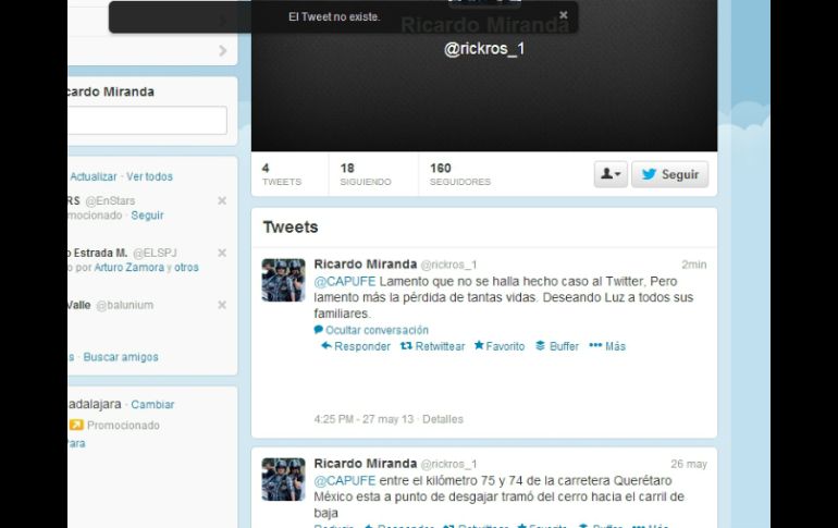 México | El organismo responde que inspeccionó la zona del desastre y no había riesgos Tuitero advirtió a Capufe sobre desgajamiento en Tepeji del Río El organismo responde que inspeccionó la zona del desastre y no había riesgos Por: EL INFORMADOR 27 de mayo de 2013 - 15:44 hs Ricardo Miranda publica un tuit lamentando la pérdida de vidas que después fue borrado. TOMADA DE @rickros_1 / GUADALAJARA, JALISCO (27/MAY/2013).- Aunque su actividad en Twitter es limitada, hoy Ricardo Miranda (@rickros_1) acapara la atención por un mensaje dirigido a la cuenta oficial de Caminos y Puentes Federales (@CAPUFE) en el que prevenía: "entre el kilómetro 75 y 74 de la carretera Querétaro México está a punto de desgajar tramo del cerro hacia el carril de baja". Los comentarios en redes sociales al respecto de este tuit, del cuál no ha habido una respuesta al usuario a través de la plataforma, han obligado a Caminos y Puentes a publicar un agregado a un comunicado con la postura del organismo ante el aviso vía Twitter que a la letra dice: 1) Se inspeccionó la zona que el señor Miranda amablemente reportó, y en ese momento no presentaba indicios de grietas o riesgos. 2) Como es sabido y los medios de Comunicación han dado cuenta de ello, el deslave se presentó en el kilómetro 70+400, es decir a 5 kilómetros del TWEET enviado. 3) CAPUFE en esta ocasión como en muchas anteriores, ha respondido con responsabilidad a las obligaciones que tiene a su cargo. Ante la respuesta de la autoridad responsable de la infraestructura carretera de México, @rickros_1 publicó un tuit que sólo estuvo unos momentos visible y después fue borrado: "Lamento que no se halla hecho caso al Twitter, Pero lamento más la pérdida de tantas vidas. Deseando Luz a todos sus familiares". Breve cronología El primer aviso fue enviado por Ricardo Miranda al organismo dependiente de la Secretaría de Comunicaciones y Transporte a las 14:29 horas del domingo y al paso de las horas se convertiría en el preludio de una tragedia que al momento cobra la vida de siete personas. Durante la tarde del mismo día, en la cuenta de @CAPUFE se dio cuenta de la "lluvia intensa" que afectaba el tramo carretero así como de otros accidentes en puntos distintos de la vía. Fue hasta las 19:46 cuando este perfil en la red social informó del desgajamiento en respuesta a Adriana Macías (@addmacias), otra usuaria que preguntó al respecto: "Autopista Querétaro - México Km. 72 se registra desgajamiento de cerro y la circulación es lenta". Casi una hora después (20:33 horas) la cuenta emitiría un mensaje general sobre el suceso: "Autopista Querétaro-México, km 70, derrumbe de cerro. Continua el cierre de circulación Total en dirección a México". Desde ese momento, el perfil ha sido una referencia para conocer información oficial sobre los trabajos de rehabilitación de la carretera y orientar a los usuarios que han tenido que buscar vías alternas. EL INFORMADOR / SERGIO RODRÍGUEZ Temas Hidalgo Estados Accidentes México Redes Sociales Lee También "La Mañanera" de Sheinbaum de hoy viernes 10 de octubre de 2025 La distopía de Clara Brugada El efecto Donald Trump Gobierno federal refuerza combate a extorsión y desapariciones Recibe las últimas noticias en tu e-mail Todo lo que necesitas saber para comenzar tu día Registrarse implica aceptar los Términos y Condiciones
