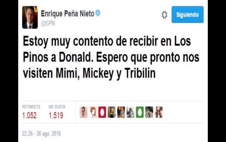 GUADALAJARA, JALISCO (31/AGO/2016).- Luego de que se confirmó que el candidato republicano a la presidencia de Estados Unidos, Donald Trump, se reunirá hoy en privado con el presidente Enrique Peña Nieto, los usuarios de redes sociales han manifestado su rechazo a la visita del magnate.En Twitter se convirtió en Trending Topic la etiqueta #SrTrumpConTodoRespeto, mediante la cual los usuarios han expresado que el polémico estadounidense no es bienvenido en México y han compartido memes sobre el encuentro que tendrá lugar alrededor de las 15:00 horas en Los Pinos.Algunas de las opiniones de los internautas:@AdrienGM: “En qué idioma se comunicarán @EPN y @realDonaldTrump ? Pues en el único que tienen en común: la ignorancia #SrTrumpConTodoRespeto@PETERalvizar: “#SrTrumpConTodoRespeto quien nos llama "violadores" y "criminales" como tu, no es bienvenido a México.”@AxelGarciaLive: “#SrTrumpConTodoRespeto aquí en México no lo queremos. Donde está la CNTE para bloquear el aeropuerto cuando lo necesitas?@francotgustavo: “#SrTrumpConTodoRespeto espero que @HillaryClinton le gané la carrera presidencial y jamás tenga la "necesidad" de estar en Mexico@LaMoreDelDoc1: “Espero que mi país te dé la bienvenida que te mereces, coreando un sin fin de mentadas de madre a tu paso! #SrTrumpConTodoRespeto”No sólo los usuarios de las redes han repudiado el próximo encuentro entre los mandatarios, sino también diversas personalidades.El periodista Jorge Ramos también se sumó a las protestas y tuiteó: "Hoy se reúnen dos de las personas más odiadas y rechazadas por millones de Mexicanos en el mundo. @EPN y @realDonaldTrump.""La pregunta es si Trump se va a dusculpar por insultar a los Mexicanos y si @epn, como presidente de México, exigirá la disculpa", escribió Ramos.El cantante Moby también publicó en su muro de Facebook: “Excuseme, porque no puedo escribir muy bien en espanol... ¿los estimados amigos mexicanos, por qué usted está invitando al Trump a su país? él le ha llamado los “violadores” y los “criminales”.#Trump no es ningún amigo de México.”La panista Margarita Zavala igualmente se manifestó contra el encuentro en una publicación de Facebook: “Señor Donald J. Trump, aunque lo hayan invitado, sepa que no es bienvenido. Los mexicanos tenemos dignidad y repudiamos su discurso de odio.El alcalde de Guadalajara, Enrique Alfaro, escribió en su cuenta de Facebook que una persona que ''incita al odio, al racismo, a la violencia e incluso a la guerra, no debería ser invitada a nuestro país''. Y agregó que su visita ofende ''nuestra dignidad'', después de tratar a los mexicanos como lo ha hecho.EL INFORMADOR / MARÍA JOSÉ VILLANUEVA