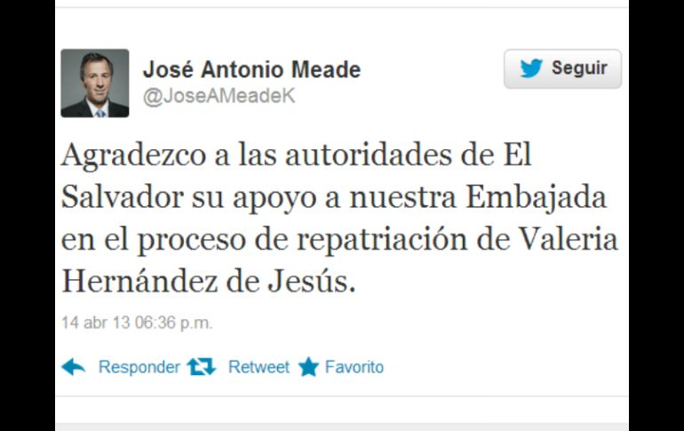 México | La Secretaría agradece a El Salvador su colaboración en el caso Valeria ya fue entregada a su mamá: SRE La Secretaría agradece a El Salvador su colaboración en el caso Por: SUN 14 de abril de 2013 - 16:24 hs José Antonio Meade agradece a las autoridades de El Salvador por su colaboración en el caso. TOMADA DE @JoseAMeadeK / CIUDAD DE MÉXICO (14/ABR/2013).- La Secretaría de Relaciones Exteriores (SRE) informó que éste domingo concluyó de manera exitosa la repatriación de la niña Valeria Hernández de Jesús, de cuatro años de edad, que desapareció el pasado 1 de Abril en Texcoco, en el Estado de México, y fue encontrada por la Policía Nacional Civil de El Salvador. En un comunicado la SRE detalló que la niña llegó a la ciudad de México en compañía de un funcionario de la Embajada de México en El Salvador y fue entregada a su madre Ana Cecilia de Jesús con la intervención de funcionarios de la Dirección General de Protección de Mexicanos en el Exterior de la Secretaría de Relaciones Exteriores. La Cancillería agradeció a las autoridades de El Salvador por "su invaluable ayuda en este caso, así como a la Procuraduría General de Justicia del estado de México que dará seguimiento a la denuncia presentada por la señora de Jesús", destacó el comunicado. Mientras que el titular de la SRE, José Antonio Meade escribió en Twitter: "Agradezco a las autoridades de El Salvador su apoyo a nuestra Embajada en el proceso de repatriación de Valeria Hernández de Jesús". La Secretaría de Relaciones Exteriores reiteró su disposición de colaborar con autoridades de todos los órdenes de gobierno, así como realizar todas las acciones que sean necesarias en las tareas de protección de los connacionales en el exterior. El caso de Valeria Hernández fue el primero que activó la "Alerta Amber" en el Estado de México, la cual tiene como propósito buscar y localizar a menores de edad ausentes. Valeria desapareció de una plaza pública en Texcoco cuando su madre montaba su puesto y al no encontrarla dio parte a las autoridades, después de 10 días la niña fue localizada en El Salvador. Temas SRE Estados Ciudad de México Desapariciones y denuncias Recibe las últimas noticias en tu e-mail Todo lo que necesitas saber para comenzar tu día Registrarse implica aceptar los Términos y Condiciones