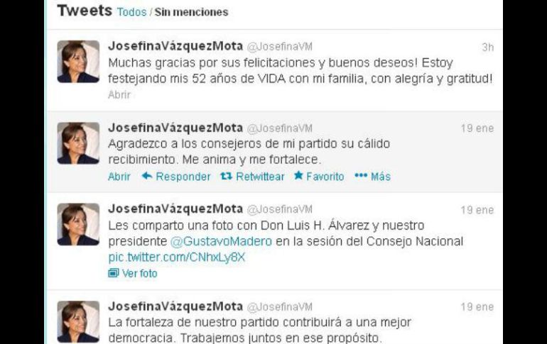 México | La excandidata presidencial agradeció felicitaciones por su cumpleaños Vázquez Mota reaparece en Twitter Muchas gracias por sus felicitaciones y buenos deseos! Estoy festejando mis 52 años de VIDA con mi familia, con alegría y gratitud!, escribió Josefina Vázquez Mota Por: SUN 20 de enero de 2013 - 12:43 hs Imagen de la publicación de Josefina Vázquez Mota, en su cuenta de Twitter. ESPECIAL / CIUDAD DE MÉXICO (20/ENE/2013).- Además de reaparecer este sábado en la sesión del Consejo Nacional del PAN, la excandidata presidencial del blanquiazul también volvió a utilizar su cuenta en la red social de Twitter. La ex secretaria de Educación posteó diversos mensajes desde ayer, además de subir una foto con el líder nacional, Gustavo Madero y Luis H. Álvarez. También la panista agradeció las felicitaciones que le han enviado distintos panistas debido a que este domingo cumple 52 años de edad. "Muchas gracias por sus felicitaciones y buenos deseos! Estoy festejando mis 52 años de VIDA con mi familia, con alegría y gratitud!", escribió la panista. También escribió: "Debemos edificar un futuro con la experiencia de triunfos y derrotas que hemos vivido. Construyamos con nuestros valores una mejor historia". Además, "La fortaleza de nuestro partido contribuirá a una mejor democracia. Trabajemos juntos en ese propósito". Como resultado del plantón en la sede de la Legislatura oaxaqueña, en el transcurso de la semana pasada los diputados sesionaron en un hotel y cerca de 300 trabajadores del Poder Legislativo no laboraron. Temas PAN Política Josefina Vázquez Mota Twitter Lee También Día de Muertos 2025: ¿Por qué será más caro el Pan de Muerto este año? Hamás dice que recibió garantías de que la guerra en Gaza terminó Esta es la última guerra que Trump resolvió, según él mismo Sociales: Che Eguiarte 40’s party Recibe las últimas noticias en tu e-mail Todo lo que necesitas saber para comenzar tu día Registrarse implica aceptar los Términos y Condiciones