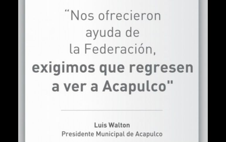 México | El alcalde de la ciudad ofreció un discurso a los pobladores de Barra Vieja Walton pide a Peña Nieto que acuda a Acapulco para apoyar El alcalde de la ciudad ofreció un emotivo discurso a los pobladores de Barra Vieja Por: EL INFORMADOR 6 de febrero de 2013 - 15:18 hs ACAPULCO, GUERRERO (06/FEB/2013).- Luis Walton, Alcalde de Acapulco, pidió al Presidente Enrique Peña Nieto que regrese al municipio, pues cuando visitó el puerto se comprometió a ayudar a Acapulco, sin embargo, “no se ha visto”. El alcalde lloró en un discurso que dio ante pobladores de Barra Vieja donde les pidió denunciar si conocían a alguno de los culpables de la violación a seis ciudadanas españolas. El edil dijo: ” Vengo a afrontar las responsabilidades de los hechos, esto no puede volver a suceder”. En cuanto a su petición de que el Mandatario mexicano acuda a la ciudad mencionó: “Vino a Acapulco y dijo que iba a ayudar en la ciudad en varios problemas pero la verdad es que la ayuda no se ha visto (…) Yo le he pedido que tiene que ver por Acapulco y tiene que haber mayor seguridad en Acapulco, sí se lo pedí” El Alcalde concluyó su discurso con un gran sentimiento y con la voz entrecortada solicitó el apoyo de los pobladores para que juntos rescaten Acapulco, “queremos el apoyo todos los acapulqueños”. Más tarde, Walton admitió que Playa Encantada, donde ocurrieron los hechos, está alejada del centro de la ciudad y carecía de suficiente seguridad. ”La Policía Preventiva, que es la que depende de mí, debería haber tenido una mayor vigilancia ahí”. “Nosotros tenemos la mayor seguridad en la costera Miguel Alemán, que es el área turística de Acapulco, en Playa de Amate, y debemos reconocer que en el lugar donde sucedieron los hechos pues no había la seguridad suficiente para que esto no sucediera”, dijo Walton. El edil también urgió a la Federación un apoyo económico para liquidar a los 500 elementos policiales que no pasaron los exámenes de control y confianza. Walton Aburto aseguró que no se puede trabajar en esas condiciones en la ciudad; “los señores que no están certificado y calificados tienen que irse, no hay vuelta atrás”, dijo. Temas Enrique Peña Nieto Violencia contra las mujeres Estados Guerrero Acapulco Lee También Inicia entrega de tarjetas Pensión Mujeres Bienestar en Jalisco; ¿cómo y dónde recogerla? Detienen a Miguel Ángel 'N', vinculado por el homicidio del sacerdote Bertoldo Pantaleón SMN advierte: Tormenta Raymond dejará lluvias intensas y fuertes vientos en 4 estados ¿Bad Bunny fuera del Super Bowl? Este sería el show alternativo Recibe las últimas noticias en tu e-mail Todo lo que necesitas saber para comenzar tu día Registrarse implica aceptar los Términos y Condiciones