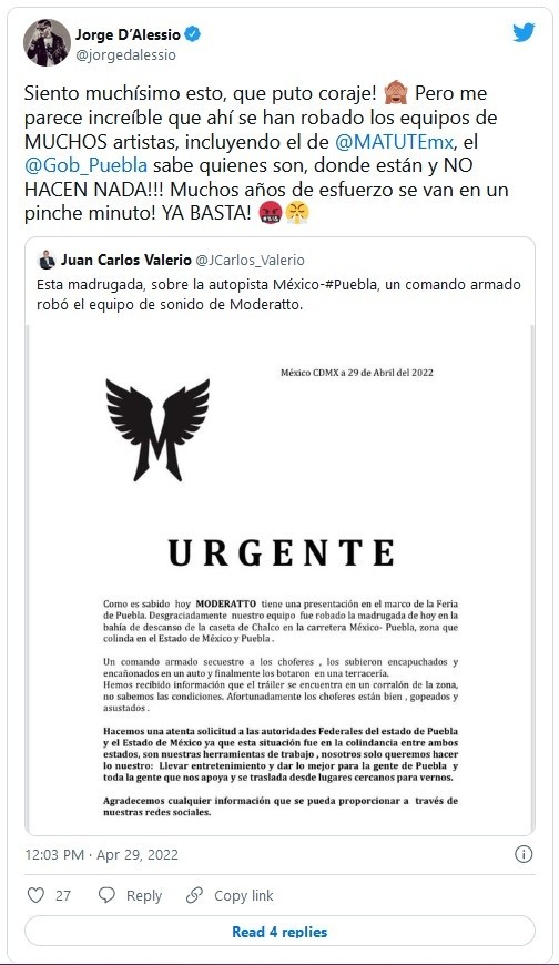 De nueva cuenta la delincuencia hizo de las suyas, en esta ocasión le tocó al grupo Moderatto perder su equipo, cuando el tráiler que lo llevaba de la Ciudad de México a Puebla, donde se presentarían esta noche, fue interceptado por un comando armado que despojó al personal de la banda del vehículo y de todo lo que contenía; pero esta no es la primera vez que pasa algo parecido en las carreteras de México, y ya ha habido varios artistas que han tenido que pasar por lo mismo.JM
