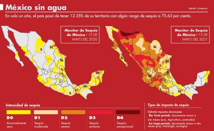 Las lluvias registradas en la primera quincena de mayo ayudaron a que algunas zonas de país salieran de la sequía en la que se encontraban, sin embargo, existieron otras entidades en territorio mexicano que su situación no cambió, inclusive su panorama empeoró.Según el último reporte del Monitor de Sequía de México, elaborado por la Comisión Nacional del Agua (Conagua) durante la última quincena de mayo, el porcentaje de área con sequía de moderada a excepcional (D1 a D4) a nivel nacional fue de 75.63%, ligeramente mayor (0.36%) que lo cuantificado al 30 de abril pasado, cuando se registró 75.27 por ciento.De igual modo, se detalló en el informe que de los 32 estados de la República, 16 entidades registraron 100% de sus municipios con algún tipo de sequía.El informe también detalló que las regiones en donde se incrementaron las condiciones de sequía en nuestro país fueron: la península de Baja California, Sonora, Chihuahua, Coahuila, Sinaloa, Durango, Nayarit, Colima y Quintana Roo. El motivo fue que se recibieron escasas o nulas precipitaciones. En esas entidades, con excepción del estado de Quintana Roo, aumentaron las áreas con sequía severa o extrema (D2 o D3).Para el caso de Baja California Sur, el incremento lo tuvo en la categoría de sequía severa (D2) ya que pasó de 31.5% del territorio en esa condición, a finales de abril, a 37.6% al 15 de mayo. En Baja California el aumento también se vio reflejado en la misma escala de 4.7 a 19.1 por ciento.Asimismo, otro estado que tuvo incremento en la categoría D2 fue Nayarit, al 30 de abril registró 81.5% del total de su territorio y para el 15 de mayo el dato fue 99 por ciento.En lo que respecta a la categoría de sequía extrema (D3) varios estados tuvieron incrementos; resalta el caso de Colima que pasó de 0 a 40.3%, y Sinaloa, que registró en el reporte de abril 35%, mientras que para el último informe de la dependencia la cifra fue de 53.8 por ciento.En el caso de Chihuahua, los dos indicadores tuvieron un incremento significativo. En la categoría D2 pasó de 56.2 a 60.8%, mientras que en D3 fue de 14.2% a 15.6% del territorio de la entidad que registró dicha magnitud de sequía.Cifras al alzaEn los últimos años las condiciones de sequía en el país han aumentado.De acuerdo con los registros de la Conagua, de los 2 mil 469 municipios con registro en México, mil 255 se presentaban, al 15 de mayo pasado, algún grado de sequía.En comparación, a la misma fecha, pero del 2014, la cifra de localidades sólo era de 450 que registraban algún grado de sequía.En la actualidad, el documento de la Conagua señaló que la entidad con mayor número de ayuntamientos con sequía es Jalisco con un total de 125, le sigue Michoacán con 113 y en tercer lugar Oaxaca con 98. Lo anterior significa que estas entidades, junto a Durango, pasan por algún tipo de sequía en todos sus municipios.Caso contrario se puede observar en los casos de Campeche y Tabasco, en ambas entidades, según la Conagua, 100% de sus municipios están sin afectación, además de Yucatán con 88% de sus municipios sin afectaciones y Chiapas con 87.8 por ciento.Zonas con reducción“En la primera quincena de mayo del 2021, se tuvo un inicio benéfico para la temporada de lluvias.“Las lluvias de esa quincena se distribuyeron sobre el noreste, oriente, centro, sur y sureste del país, y se asociaron principalmente al paso de la décimo cuarta tormenta invernal, los frentes fríos 54, 55 y 56 (de la temporada 2020-2021), así como al desarrollo de líneas de vaguada y el desarrollo de la tormenta tropical Andrés (la tormenta con nombre más tempranamente registrada en el Océano Pacífico Nororiental, desde 1949)”, se lee en el informe de la Comisión Nacional del Agua.Como consecuencia de lo anterior, hubo una reducción en las áreas, que considera la Conagua con sequía moderada (D1) en diferentes estados de México.El informe también detalló que la sequía de severa a extrema disminuyó ligeramente en algunas entidades del norte del país como Nuevo León, Zacatecas, Guanajuato, el norte de Michoacán y Guerrero.Ante la grave sequía que atraviesa el país, expertos coincidieron que se deben destinar más recursos a los programas de prevención, sin descuidar lo erogado a la atención de las emergencias de esta índole.México vivió del 2010 al 2012 un periodo generalizado de sequía. Un año después se creó el Programa Nacional contra la Sequía (Pronacose).Judith Domínguez, profesora investigadora del Colegio de México, indicó que además del Pronacose, el país cuenta con instrumentos financieros, de información, de gestión y coordinación contra la sequía.“Se creó el Fondo para la Atención de Emergencias (Fonden), que era un instrumento financiero, un fideicomiso. Ahora no sabemos qué es, porque desapareció, sin embargo, existe un presupuesto asignado bajo ese nombre por mucho dinero, más de 8 mil 700 millones de pesos”, indicó la también coordinadora del observatorio de seguridad hídrica del Colmex.No obstante, Domínguez añadió que los instrumentos actuales para contrarrestar la sequía en el país son insuficientes.“Sobre todo por las reducciones presupuestarias, la desaparición de fideicomisos, con la incertidumbre sobre cuáles son las reglas para pedir dinero, tengo información que en Sinaloa ya habían comenzado a pedir dinero desde diciembre y hasta ahora no había llegado nada de apoyo”, dijo.Por su parte, Víctor Orlando Magaña Rueda, investigador del Instituto de Geografía de la UNAM opinó que, para mitigar el impacto de las sequías, se necesita de la participación del gobierno y de la sociedad en general.“Cada vez que ocurre una sequía es que nos vuelven a decir que ahorremos agua, pero en cuanto se acaba no hacemos nada. El mejor momento para actuar frente a una sequía es cuando no la hay”, manifestó Magaña Rueda.Alertan por Cutzamala A su vez, Juan Francisco Bustamante 