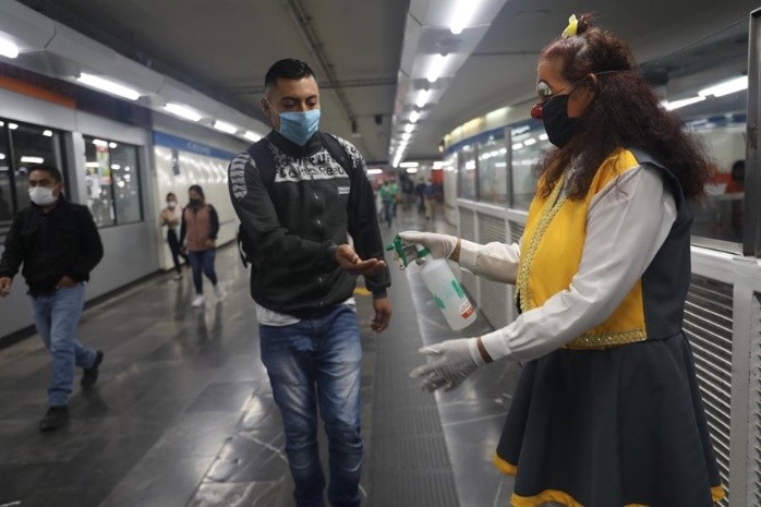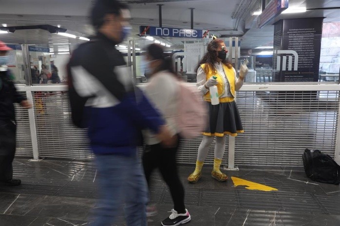 En el punto más crítico de la pandemia, los payasos buscan la mejor cara de la crisis en el Metro de Ciudad de México, una "zona de alto contagio" en la que estos artistas instruyen a los pasajeros a usar mascarillas y gel antibacterial."Si en el Metro quieres viajar, cubrebocas debes usar, hay que protegerse y proteger a los demás", grita la payaso Piñitas en la estación Pino Suárez, una de las más concurridas del Sistema de Transporte Colectivo (STC), que registra una disminución de 80 % de usuarios, según el Gobierno de Ciudad de México."Es más fácil que una persona estire la mano cuando lo hace una payasa o un payaso que cuando lo hace un policía porque a él lo ven más retador", explica la joven a Efe sobre la campaña "Que no te cargue el payaso".Esta campaña coincide con la máxima fase del COVID-19 en México, que este viernes espera su pico de contagios al sumar ya 29 mil 616, de los que ocho mil 129, el 27.45 %, han ocurrido en la capital, más que en ninguna otra entidad.Ciudad de México también lidera en decesos con un total de 696, casi una cuarta parte de los dos mil 961 registrados a nivel nacional.Por ello, la campaña con payasos, el cierre de algunas estaciones y el uso obligatorio de mascarilla se han implementado en el Metro capitalino.Pero no todo ha sido alegría para Piñitas, cuyo verdadero nombre es Alejandra Piña, quien pide ayuda para artistas urbanos como ella."¿Con qué nos entretenemos cuando no estamos haciendo nada? Con el arte, libros y demás. Entonces, es importante. A los payasos casi no se les ha dado apoyo", manifiesta.En eso coincide su colega Sonrisitas, una payasa con 35 años de trayectoria que se ha sumado a la causa en una de las conexiones de la Línea 1 con la Línea 2."No hay trabajo, porque se cerraron salones de fiesta, teatros, áreas abiertas, parques, era todo nuestro foro para trabajar. Entonces se cerró eso, se cerró nuestro trabajo, no hay. Entonces ahorita nos vino bien esta campaña", relata la artista, de nombre Cecilia Leal.Con 12 líneas y 226 kilómetros para Ciudad de México y su zona conurbada, las autoridades capitalinas reconocen al Metro como una "zona de alto contagio".Esta iniciativa es una de sus últimas estrategias para evitar la propagación del coronavirus, que también incluye la sanitización constante de los vagones."Son las adecuadas, yo creo que si esto lo hubiéramos implementado desde la primeras etapas del brote, esto no hubiera llegado a tal, pero nunca es tarde para realizarlo y están en lo correcto", opina el pasajero Martín Zambrano.Pero la campaña de los payasos representa una oportunidad de sonreír para muchos pasajeros que no pueden quedarse en casa por la naturaleza de su trabajo."Afecta tanto en lo económico como en lo moral. Mucha gente ya está harta de estar encerrada, ya quisiera salir a trabajar. Hay gente que no tiene para comer a veces, está pegando con todo y va a pegar más feo cuando pase esto", expresa Pedro González.JM