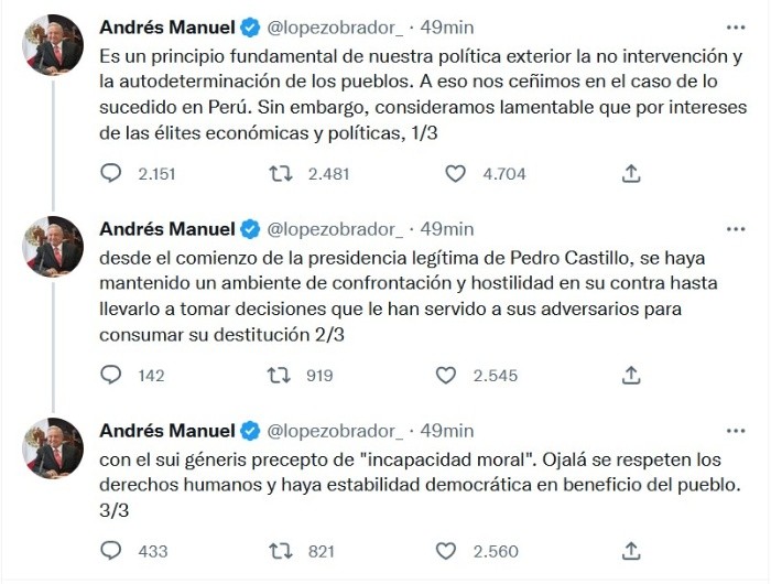 El presidente de Perú, Pedro Castillo, disolvió el miércoles el Congreso e instaló un gobierno de emergencia cuando los legisladores se disponían a votar un nuevo pedido de destitución, en la mayor crisis política desde que llegó al poder hace poco más de un año.Como respuesta, el pleno del Congreso de Perú destituyó al mandatario del país, Pedro Castillo, por "permanente incapacidad moral" con 101 de 130 votos a favor.Después de que fuera destituido como presidente de Perú, Pedro Castillo fue detenido, reportaron medios locales.Aquí toda la cobertura EN VIVO:
