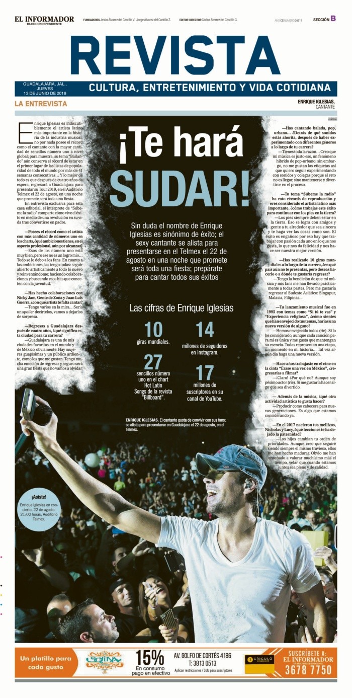 A lo largo de su historia centenaria, EL INFORMADOR ha construido una memoria cultural que no se limita a la política o la vida social, sino que abraza también el espectáculo, reflejando las transformaciones del entretenimiento en México y en el mundo. Sus portadas dedicadas a la música, el cine y la televisión han marcado generaciones de lectores, convirtiéndose en un espejo de cómo cambia la relación entre artistas y audiencias. Entre los titulares que dejaron huella, destaca “¡Te hará SUDAR! Enrique Iglesias”, con la que el medio anunció la llegada del cantante español a Guadalajara en plena efervescencia de su carrera internacional, transmitiendo la energía vibrante de los conciertos que convertían a la ciudad en una parada obligada para figuras globales.Años más tarde, nuevas generaciones encontraron su reflejo en portadas como “Danna Paola le saca provecho a su Mala fama”, publicada en 2019, que relataba cómo la intérprete mexicana transformó críticas en un éxito musical, mostrando el poder de la industria digital y las redes sociales para redefinir la relación entre público y artistas. También brillaron portadas dedicadas a Sebastián Yatra, “la voz más latina”, celebrando el ascenso del colombiano como referente del pop y la música urbana, y subrayando a Guadalajara como plaza clave para los artistas internacionales de habla hispana.La sección ha apostado además por el cruce entre música, moda y cine, con portadas que se volvieron íconos de su época. Una de las más recordadas fue “Belinda se viste de imperio y canta con Jared Leto”, donde la cantante mexicana compartió escenario con el actor y vocalista de 30 Seconds to Mars, vestida con atuendos imperiales que se convirtieron en símbolo de una época en que las colaboraciones internacionales marcaban tendencias. En el ámbito cinematográfico, titulares como “Chicuarotes, una radiografía de la juventud sin esperanza” fueron mucho más que reseñas: ofrecieron una mirada crítica a la realidad de la juventud mexicana, demostrando la capacidad del suplemento de combinar entretenimiento con reflexión social. Entrevistas exclusivas como “Jason Momoa en el trono de Aquaman”, realizada en Nueva York, acercaron al público tapatío al actor que redefinió a uno de los superhéroes más icónicos de DC Comics, mientras que otras portadas destacaron la vocación cinematográfica del suplemento: “El origen de Spider-Man y otras confesiones de Stan” permitió a los lectores compartir recuerdos íntimos de Stan Lee, leyenda de Marvel; “¡Puro acero! Superman renace” exploró el regreso del Hombre de Acero y su vigencia como mito de la cultura pop; y “Willem Dafoe, un punch al cine y a la vida” reveló la visión del actor sobre su oficio y legado, combinando introspección artística con vitalidad personal.A través de estas historias, esta casa editorial ha documentado la evolución del espectáculo, conectando generaciones y transformando cada portada en un testimonio de la cultura popular que trasciende el tiempo y los géneros.No todas las portadas se centraron en nombres específicos: algunas apostaron por la fuerza de la metáfora. Tal es el caso de “Un terremoto humano”, que en realidad encabezó una entrevista con Dwayne Johnson, “La Roca”, en el marco del estreno de “La Falla de San Francisco”. El título evocaba tanto la fuerza física y carisma del actor como la trama del filme centrado en catástrofes naturales.Igualmente, titulares como “Cuando estamos enamorados hacemos cosas insensatas”: Lady Gaga mostraron el estilo directo del suplemento, recogiendo frases memorables de los artistas para convertirlas en portadas que atrapaban a los lectores, en este caso resaltando la visión de Gaga sobre el amor y la vida artística.Cabe señalar que la sección no ha dejado de lado a los íconos de la música latina. La portada “Ricky Martin, pasión intacta” retrató el regreso del boricua a los escenarios, subrayando la energía y autenticidad que, tras décadas de carrera, seguían conquistando al público. Estas notas demostraban cómo el suplemento funcionaba no solo como agenda cultural, sino como crónica de permanencia y renovación en la industria musical.Desde los años ochenta hasta la era digital, las portadas de espectáculos de esta casa editorial han acompañado a los tapatíos en sus experiencias culturales: conciertos masivos, estrenos de cine, lanzamientos musicales y entrevistas con artistas en ascenso. Más que simples titulares, han sido ventanas a los cambios de la industria, los gustos del público y las conversaciones culturales de cada época.Hoy, en un escenario dominado por plataformas digitales y redes sociales, aquellas portadas se mantienen como testimonio histórico de la forma en que Guadalajara ha vivido, celebrado y reflexionado el espectáculo.Recorrer la sección de espectáculos de EL INFORMADOR es adentrarse en décadas de cultura popular a través de la mirada de Guadalajara. No se trata únicamente de reseñar conciertos, películas o artistas de moda; sus páginas han logrado equilibrar lo local y lo internacional, lo frívolo y lo reflexivo, la farándula y la crítica cultural. La riqueza de esta cobertura reside en su diversidad: la música se vive desde los conciertos que hicieron vibrar a la ciudad, de Maluma a Shakira, hasta entrevistas exclusivas que revelan la conexión íntima entre artistas y público. En el cine, portadas dedicadas a producciones nacionales y extranjeras muestran que la narrativa cinematográfica va mucho más allá de la reseña, permitiendo asomarse a la voz y la visión de sus protagonistas. Televisión, cultura pop y fenómenos de la pantalla mexicana retratan series y personajes que marcaron generaciones, configurando un mapa vivo de nuestra memoria colectiva.El estilo editorial de la sección ha dejado una marca distintiva: titulares impactantes como “¡Puro acero! Super