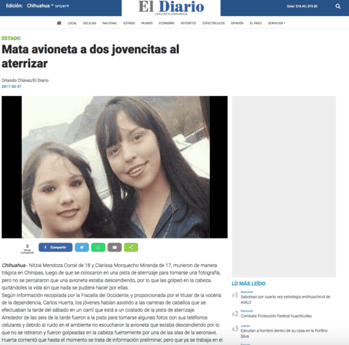 Dos mujeres que se tomaban una selfie al lado de una pista de aterrizaje serrana, murieron, al parecer, accidentalmente; un piloto aviador que solía viajar a la Sierra Tarahumara y un maestro de artes marciales retirado fueron asesinados en 2017. Antes de que acabara el año, otro hombre murió baleado también en el norte del país. Todas estas muertes resultaron asociadas al homicidio de Miroslava Breach, ocurrido el 23 de marzo de 2017, en Chihuahua, México. El Colectivo 23 de marzo, formado por periodistas mexicanos, en colaboración con las organizaciones internacionales Forbidden Stories, Bellingcat y el Centro Latinoamericano de Investigaciones Periodísticas (CLIP), investigaron qué fue cierto y qué no al vincular estas cinco muertes con la de la periodista. También contamos por qué de haberlas investigado en profundidad, las autoridades hubieran arrojado luz sobre el crimen de la respetada corresponsal de La Jornada.Cada marzo, en la pista ilegal de Chínipas, Chihuahua, pueblo serrano de difícil acceso, que colinda con el estado de Sonora, cantantes de música norteña aterrizan para festejarle su cumpleaños a Alfredo Salazar Ramírez, alias El Muñeco, socio del cártel de Sinaloa, preso en México y con pedido de extradición a Estados Unidos para enfrentar cargos por tráfico de cocaína.Alfredo es hijo de Adán Salazar Zamorano, ‘Don Adán’, preso desde 2011, y patriarca de un violento clan llamado Los Salazares que -lo denunció Miroslava Breach en sus notas- ha infiltrado la política local y la policía de varios municipios de la Sierra Tarahumara.El sábado 25 de marzo de 2017, dos días después del asesinato de Miroslava en Chihuahua capital, los habitantes de Chínipas eran convidados a una carrera de caballos –en honor de Alfredo- en la pista de aterrizaje del poblado; entre ellos estaba Nitzia Mendoza, de 18 años, y su amiga Yoselín Morquecho, de 17, quienes observaban la carrera, trepadas en la caja de una camioneta pick-up estacionada junto a la pista. Pasaban las dos de la tarde, cuando los chicas se tomaron selfie, y según lo difundió la prensa, en ese instante una avioneta las golpeó en la cabeza y ahí mismo murieron. A pesar de que, las autoridades municipales guardaron silencio e intentaron negar los hechos, un accidente tan inaudito se volvió noticia mundial.Un testigo de los hechos que pidió el anonimato relató a este Colectivo que la tragedia ocurrió porque a la misma hora aterrizaron, no una, sino tres o hasta cuatro avionetas. Dijo que un piloto apurado, o imprudente, bajó en el extremo de la pista donde la gente estaba congregada, y por no aterrizar donde debía Yoselin y Nitzia no vieron llegar su aeronave. “Levantaron a las plebas, las llevaron al centro de salud y el piloto automáticamente, inmediatamente, se fue de vuelta. Así de rápido”, dijo.Entonces, ocurrió algo que hizo enmudecer a todos los chinipenses: un grupo de personas armadas impidió que la gente saliera del pueblo hasta cerciorarse de que borraran toda foto o video de sus celulares. Esto lo publicó días después El Diario de Chihuahua, y lo confirmó el testigo: “Al salir de la pista había personas ahí y recogían todos los teléfonos (…), ahí mismo borraron todo (…) entonces salió la gente. No salió nadie antes”.Cuando los medios locales buscaron a los funcionarios municipales para entrevistarlos sobre la tragedia, ninguno respondió. La dirección de policía de Chínipas negó que ese accidente hubiera ocurrido. Incluso, a diferencia de otras fiestas en honor de Los Salazar publicitadas en Youtube donde se ve a cantantes gruperos exaltando en sus corridos las “proezas” de los integrantes de ese grupo criminal (algunos de ellos perseguidos por la DEA), en esta ocasión no hubo rastros en internet. El medio investigativo británico Bellingcat, experto en rastreos de fuentes abiertas, confirmó que “existe una ausencia de información de fuente abierta de imágenes y/o videos tomados por participantes del evento ese 25 de marzo”.No hubo indagación por parte de la Secretaría de Comunicaciones y Transportes que ni siquiera incluyó el accidente entre los ocurridos en 2017, a pesar de que tiene el mandato de investigarlo. La Fiscalía dijo que no tenía el número de matrícula de la aeronave. No hubo más investigación.Cuando este colectivo preguntó sobre la muerte de Nitzia y Yoselín, no sólo en Chínipas sino en otros sitios de Chihuahua o en Sonora, algunas personas colgaron el teléfono cuando se les explicó la razón de la llamada, o gritaron con pánico que si hablaban las matarían. Cinco personas aseguraron que Los Salazar tienen interceptados los celulares y hasta las redes sociales.Meses después se supo la posible razón del hermetismo. Fue a partir del 25 de diciembre de 2017, cuando el gobernador Javier Corral publicó en Twitter que había sido capturado Juan Carlos Moreno Ochoa alias El Larry, a quien identificó como el “autor intelectual del homicidio de la periodista Miroslava Breach Velducea”. A El Larry se le acusa de ser el jefe de sicarios en Chínipas.La valiente periodista, quien, al igual que Los Salazares, era originaria de Chínipas, había denunciado que era un pueblo sin ley. Ella misma había cubierto los desplazamientos y asesinatos causados por las disputas territoriales del grupo y su intento por controlar el municipio, ya no sólo con las armas. Habían logrado que el PRI postulara a uno de sus miembros (Juan Salazar Gaxiola) como candidato a presidente municipal para las elecciones de junio de 2016. Luego de que tumbara esa candidatura (con una nota que también sacó la corresponsal de Proceso en marzo de ese año), y a pesar de que recibió amenazas, Miroslava siguió publicando en La Jornada y El Norte de Ciudad Juárez sus investigaciones. Ella acusó al presidente municipal de ser protector de los narcos y al jefe de su policía (la misma que negó el accidente) de estar comandada 