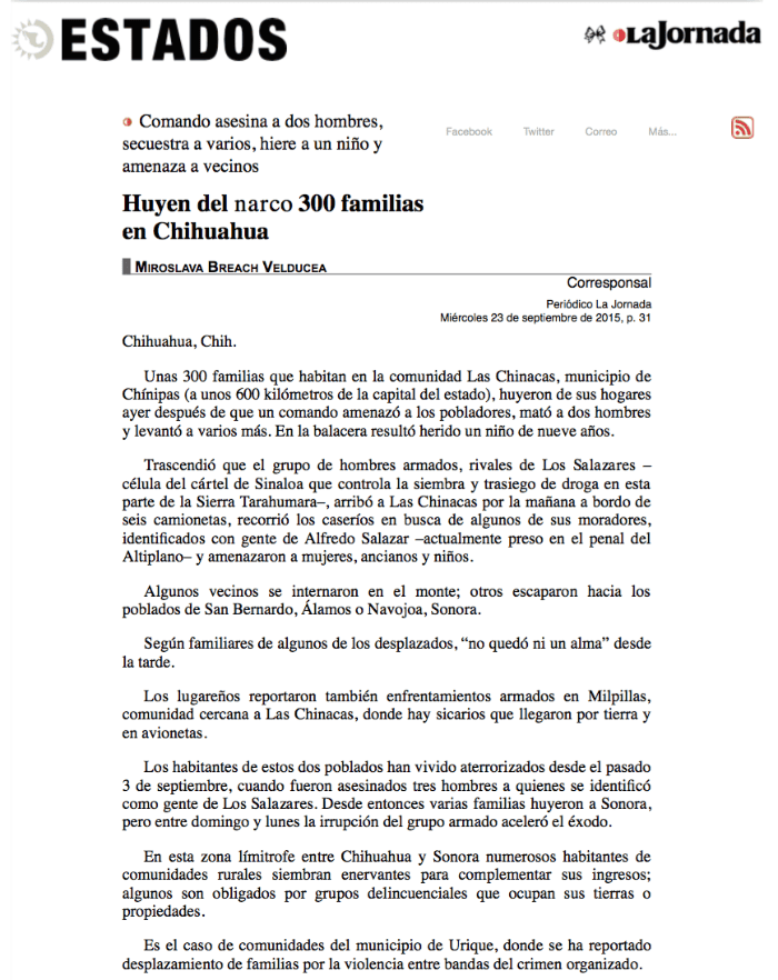 Miroslava Breach vivió bajo acoso constante desde marzo de 2016, cuando comenzó a ser presionada por sus publicaciones sobre los vínculos entre grupos del narcotráfico y sus fichas en la política. Ella advirtió de sus amenazas a su viejo amigo Javier Corral, recién electo gobernador de Chihuahua, y a los encargados a nivel federal del mecanismo para proteger periodistas. El Colectivo 23 de marzo, formado por periodistas mexicanos, en colaboración con las organizaciones internacionales Forbidden Stories, Bellingcat y el Centro Latinoamericano de Investigaciones Periodísticas (CLIP), reconstruyó la trama de amenazas vinculadas a sus publicaciones, las advertencias que lanzó sobre el peligro en que estaba y las pistas que dejó en sus publicaciones antes de su asesinato el 23 de marzo del 2017 y que las autoridades no profundizaron.Antes del asesinato, un Malibú gris rondaba por la calle José María Mata, en la colonia de Granjas, de la ciudad de Chihuahua. Las cámaras de vigilancia lo registraron seis veces entre el 21 y el 22 de marzo de 2017, mientras pasaba frente a la casa de dos pisos, ahora tristemente famosa. Fue en la cochera de ese número 1609, con sus rejas café y un patio delantero lleno de plantas, donde un hombre asesinó de ocho tiros a la periodista Miroslava Breach Velducea, la mañana del 23 de marzo, mientras esperaba a su hijo para llevarlo a la escuela.Pocos días antes de su muerte, una de sus cuatro hermanas estuvo de visita y recuerda que la tarde del 20 de marzo, mientras juntas descargaban plantas de la camioneta guinda de Miroslava, sus ojos cruzaron la mirada con un hombre que caminaba por la banqueta. Un escalofrío le cruzó el cuerpo. Cuando supo del asesinato, entendió que su hermana estuvo bajo estrecha vigilancia.La veterana corresponsal del diario nacional La Jornada, y autora de las afiladas columnas políticas que publicaba El Norte de Ciudad Juárez se había acostumbrado a vivir bajo acoso por lo que publicaba. Nadie ha podido establecer cuántos mensajes intimidatorios recibió hasta el día de su asesinato.Meses antes de su homicidio, sus parientes y amigos cercanos comenzaron a notar que mencionaba con frecuencia la posibilidad de su muerte. La familia ya se había acostumbrado a sus osados reportajes y ella a recibir mensajes amenazantes a los que parecía no darles importancia. Pero a partir de diciembre de 2017 hizo cosas anormales como pedir la cotización para blindar los vidrios de su camioneta. También repetía a sus hermanas cómo debía ser dividida su herencia entre sus dos hijos –una veinteañera y un adolescente de 14 años-, hablaba de sus seguros de vida y quién debía encargarse del menor si ella faltaba.Algunos colegas mencionaron a este Colectivo que sus últimos meses la escucharon cuestionarse si debía abandonar el oficio y dedicarse a cocinar, como tanto disfrutaba, pero ella misma se interrumpía y terminaba hablando de los planes de afianzar su agencia de noticias MIR o repitiendo que no podía abandonar la profesión porque, decía, “alguien tiene que decir las cosas”.Su hermana mayor, Rosa María, recuerda que llegó a pedirle a Miroslava que no contara de sus amenazas si no estaba dispuesta a hacer algo para cuidarse. Algo como informarle a su viejo amigo Javier Corral, el antes senador, quien a finales de 2016 acababa de convertirse en gobernador de Chihuahua por el PAN.El acoso contra Miroslava Breach Velducea comenzó un año antes de su muerte específicamente cuando denunció los desplazamientos por violencia en la Sierra Tarahumara.Las amenazas empezaron a partir del 4 de marzo de 2016 en que publicó un reportaje –de manera coordinada con la corresponsal de Proceso, Patricia Mayorga, como medida de protección- sobre la estrategia de varios grupos criminales de imponer candidatos a presidentes municipales. Con sus denuncias tumbaron a dos candidatos del PRI, uno de ellos era el candidato de Chínipas, Juan Salazar Ochoa, sobrino de los fundadores de un grupo armado que controla una importante franja al sur de la Sierra Tarahumara colindante con Sonora llamado Los Salazares.Como Miroslava era nació en Chínipas y fue criada en Navojoa, Sonora, conocía muy bien al grupo de Los Salazares, pues ellos también eran originarios de esa misma tierra y habían expandido sus negocios al sur de Sonora. Los Salazares era una numerosa familia que de rancheros pasaron a ser socios del Cártel de Sinaloa y dos de sus integrantes estuvieron entre los más buscados por la agencia estadounidense antinarcóticos, la DEA.Miroslava redactó su primera nota de denuncia sobre el terror instaurado por grupos criminales en la Sierra Tarahumara en 1999 cuando publicó una denuncia de organizaciones de derechos humanos acerca de la incursión de hombres armados que mataban, torturaban gente y quemaban viviendas en las comunidades indígenas rarámuris para obligarlas a cultivar drogas. Un año después, mencionó por primera vez en una nota a Adán Salazar Zamorano, el fundador del grupo de Los Salazares, de quien publicó el rumor de que es el “principal productor y comprador de droga en la zona serrana". Luego señaló cómo las autoridades lo habían dejado escapar a pesar de que habían sido detenido con armas, y otro episodio en el que sufrió un atetado en un fraccionamiento elegante de Chihuahua del que lo salvaron sus escoltas armados.Aunque Miroslava había estudiado Ciencias Políticas, y tenía facilidad y le gustaba hacer crónicas parlamentarias, o escribir columnas con las que ponía a temblar a los políticos, un colega recuerda que ella le explicó que había pasado de cubrir corrupción política a violencia “cuando la nota política se convirtió en nota roja”. Justo desde el año 2008 Chihuahua se había convertido en uno de los estados más violentos y Ciudad Juárez por dos años fue la ciudad más violenta del mundo.Esa década Miroslava fue describiendo en sus reportajes cómo los grupo