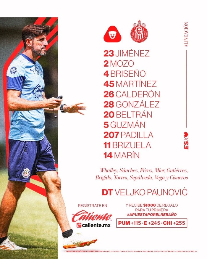 Deportes | Pumas vs Chivas • Momentos destacados • Jornada 17 • Liga MX Chivas visitará la cancha de Ciudad Universitaria para enfrentar a Pumas en busca de tres puntos que le den un mejor acomodo en la tabla general de cara a la Liguilla del Apertura 2023 Sergio Alejandro Velázquez 11 de noviembre de 2023 - 18:00 hs PUMAS1 ‒ 0CHIVAS Fin del partido En un complicado encuentro, Chivas fue derrotado con un marcador 1-0 por Pumas. Es así como el Rebaño no pudo conseguir los deseados tres puntos que les darían una mejor posición en la tabla general para la Liguilla. Fue el “Toro” Fernández quien marcó el gol que le dio la victoria a los universitarios en su propia casa, además de que Alexis Vega tuvo un cobro fallido de penal que complicó la situación para el conjunto Rojiblanco. 94' El "Chino" Huerta queda cerca de marcar el segundo Huerta se acerca en estos últimos momentos del partido al área de Chivas para un disparo que llega a los guantes de Jiménez. 90' Se agregan 6 minutos al segundo tiempo 77' ¡Alexis Vega falla el penal! Julio González ataja el balón tras el cobro de Vega y Chivas se queda sin el empate. ¡Julio González detiene el penal de Alexis Vega! ��⚽ �� Pumas 1-0 Chivas �� �� EN VIVO: https://t.co/pe6Rc0HuVv �� @MiCanal5#BienvenidoAndreMarin | #ad pic.twitter.com/6cCX44ElBe — TUDN MEX (@TUDNMEX) November 12, 2023 74' ¡Penal en favor de Chivas! Tras un cobro de tiro libre del Rebaño, una mano tiene lugar en el área de Pumas. 73' ¡Se revisa jugada por un posible penal para Chivas! 68' Chicote dispara por arriba del arco Chivas consigue una oportunidad en ofensiva que no logra posicionarse bien para diversos jugadores; finalmente Chicote consiguió el balón para rematar sin mucho éxito. 58' Pauno hace modificaciones y Vega se vuelve a ver con el conjunto Rojiblanco Víctor Guzmán y Yael Padilla se van para dejar entrar a Érick Gutiérrez y Alexis Vega. 56' Amarilla para Chivas Yael Padilla se lleva la primera para Chivas tras un encuentro con el "Chino" Huerta. 52' Cae la primera amarilla para Pumas Jesús Rivas es el primer amonestado del partido. 50' La posesión del balón se mantiene en constante cambio Chivas regresó del descanso con mayor confianza, pero se mantienen sin lograr concretar un buen posicionamiento. Comienza el segundo tiempo Fin del primer tiempo Ambos equipos se van al descanso tras varias oportunidades que Pumas no logró concretar para sacar mayor ventaja a Chivas. 45' Se agregan 3 minutos al primer tiempo 38' Chivas dispara y González frena el empate Yael Padilla remata para conseguir el disparo más peligroso que ha dado Chivas en lo que va del partido. 35' ¡Poste para Pumas! El Toro Fernández se queda cerca de un doblete tras un tiro de esquina 23' El Rebaño empieza con sus primeros acercamientos Chivas comienza a tomar posesión del balón, pero no logra vislumbrar una posible anotación. 15' ¡Pumas no deja de generar peligro! Tras la anotación de los universitarios, las aproximaciones de Pumas no dejan de acumularse y Chivas lucha por evitar el segundo. 11' ¡Gooooooooooooooooooooooool de Pumas! Gabriel Fernández dispara al arco y logra sobreponerse ante Chivas al inicio del partido. ��⚽�� ¡Goooooooool de Pumas! ��⚽�� ¡Goooooooool de Pumas! Toro Fernández abre el marcador ������ �� Pumas 1-0 Chivas �� �� EN VIVO: https://t.co/pe6Rc0HuVv �� @MiCanal5#BienvenidoAndreMarin pic.twitter.com/xtjl0LhXgC — TUDN MEX (@TUDNMEX) November 12, 2023 5' El partido comienza con Pumas insistiendo El enfrentamiento inicia con un acercamiento de peligro de Pumas; los universitarios mantienen la posesión durante los primeros minutos. Inicia el primer tiempo Comienza a rodar el balón en la cancha del Estadio Olímpico Universitario. Alineación de Chivas Temas Chivas Pumas de la UNAM Liga MX Futbol Mexicano Lee También Ulises Dávila se declara culpable por amaño de partidos; recibirá sentencia en diciembre El Real Oviedo destituye a Veljko Paunovic Mundial Sub-20: EU golea a Italia y enfrentará a Marruecos NFL: Sorpresiva derrota de los Eagles ante Giants