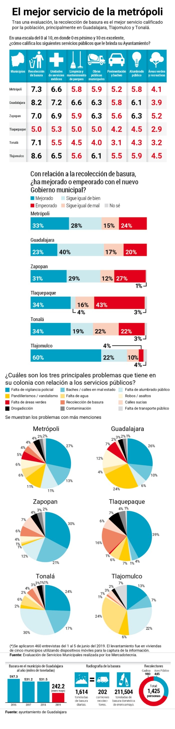 La recolección de basura es el servicio mejor calificado por la población, principalmente en Guadalajara y Tlajomulco, revela la Evaluación de Servicios Municipales que realizó la consultora Ice Mercadotecnia en junio pasado. En una escala del 0 al 10 obtuvo la puntuación más alta en la metrópoli: 7.3. Sin embargo, en la medición por municipio Tlaquepaque reprobó (5).De siete servicios evaluados con una visión metropolitana, los servicios médicos quedaron en la segunda posición, con 6.6 puntos. Los cinco restantes reprobaron: limpieza y mantenimiento en parques y camellones, obras públicas, pavimentación y bacheo, alumbrado público y áreas recreativas.La principal causa de la mala calificación en Tlaquepaque, de acuerdo con el titular de Aseo Público, Jesús Gabriel Padilla, es la falta de unidades nuevas.Por su parte, en Guadalajara la frecuencia del paso de los camiones, por algún problema en éstos, es la principal dificultad, afirma Óscar Villalobos, coordinador de Servicios Públicos del Ayuntamiento. Para mejorarlo, la empresa Caabsa Eagle ya trabaja para renovar la flota. “No podemos tener camiones de más de nueve años (de antigüedad). A finales de 2018, ellos (Caabsa) subieron al Cabildo la solicitud de un crédito por más de 200 millones de pesos para la adquisición de alrededor de 100 nuevos vehículos, para sustituir los que ya no tengan esta vigencia. Con esto tendremos un parque vehicular nuevo y con más capacidad de carga, pues se pretende que en lugar de ocho toneladas carguen entre 12 y 14 cada uno”.José Miguel de Lachica, director de Mantenimiento de Tlajomulco, subraya que, para resolver el problema por la falta de unidades, derivado por las fallas que provocan las lluvias, el Ayuntamiento cuenta con aproximadamente cinco unidades de inventario para no dejar de brindar el servicio. También buscan reemplazar algunos vehículos, aunque se encuentran en pláticas entre el municipio y la concesionaria.En Tonalá, el secretario general, Manuel Salvador Romero, responde que se encuentran en constante comunicación y mesas de trabajo con Caabsa para pasar los reportes de la ciudadanía y buscar soluciones con los camiones que tienen en Aseo Público.En Zapopan, donde el municipio se encarga de la recolección, Francis Bujaidar, coordinador de Servicios Públicos, contesta que de los 210 camiones disponibles sólo 155 funcionan. Al igual que en Tlaquepaque, en Zapopan tienen unidades de más de 20 años de antigüedad, lo que hace más deficiente el servicio. Sin embargo, buscan comprar 135 vehículos.En general, la recolección de basura es el servicio mejor evaluado en la Zona Metropolitana de Guadalajara, tras una evaluación que también se aplicó en las unidades de servicios médicos, limpieza y mantenimiento de parques y camellones, obras públicas municipales, pavimentación y bacheo, alumbrado público y áreas verdes y recreativas. Sin embargo, Tlaquepaque es el único municipio reprobado en el servicio de recolección de basura, con una calificación de 5. Lo anterior, de acuerdo con la Evaluación de Servicios Municipales aplicada en junio pasado por la empresa Ice Mercadotecnia.Aunque 34% de los habitantes de Tlaquepaque opinó que mejoró el servicio de recolección de basura, 43% respondió lo contrario, que empeoró. Es el municipio en donde existe la mayor desacreditación sobre este servicio.Ante la pregunta: ¿Cuáles tres servicios públicos son, en su opinión, los más importantes para el bienestar de la población? En Tlaquepaque destaca que el primero fue la recolección de basura, ante las fallas y los problemas que se provocan en los barrios o las colonias. En este municipio, 39% contestó que es el más importante para su bienestar, mientras que en segundo lugar fue la vigilancia policial, con 20 por ciento.Sobre la anterior pregunta, el servicio de recolección de basura en Guadalajara es tan bien calificado y eficiente, que los encuestados opinaron que el alumbrado público es el principal servicio que requieren para el bienestar, con 65 por ciento.Jesús Gabriel Padilla, director de Aseo Público de Tlaquepaque, explicó que esto se debe, principalmente, a la falta de unidades o, más bien, a las unidades viejas y en mal estado, ya que algunas tienen hasta 30 años.“En 2015, cuando entró la administración (de María Elena Limón), 39% de las unidades eran de 1980 y 1990, lo que causa que se descompongan e imposibilita una recolección constante por la logística” en las calles del municipio.Señaló que, para resolver este problema, ya se compraron seis unidades nuevas y se tienen estimadas, para este año, otras 11, con lo que se disminuiría en más de la mitad ese 39% de unidades antiguas, las cuales se darían de baja para renovar la flota.“El servicio que se da es directamente proporcional a las herramientas de trabajo y a la disposición que tenemos de éstas. Muchas veces no es tanto que el personal no está haciendo bien su trabajo, sino que no hay herramientas con qué hacerlo”.Además, Jesús Gabriel Padilla remarcó que el Sureste del municipio es el que más sufre por esto, pues los camiones, que recolectan 10 toneladas al día, no pueden ingresar a las colonias de este lugar ya que es una zona donde los cables están muy abajo y las condiciones geográficas de terracería (y lodo en tiempo de lluvias) les impide el paso. “Lo que hacemos en esos casos es meter camionetas de 3.5 toneladas y, aún así, muchas veces se dificulta el ingreso”.Por su parte, Tlajomulco (8.6), Guadalajara (8.2), Tonalá (7.1) y Zapopan (7) obtuvieron mejores calificaciones en recolección de basura.De los siete servicios evaluados en Tlaquepaque, se remarca que la población reprobó todos. Y el peor fue para las áreas verdes y recreativas, con 2.9 puntos.Con el fin de mejorar cada vez más el servicio que brinda Caabsa Eagle a Guadalajara, Tonalá y Tlajomulco de Zúñiga en la recolección de basura, Antonio Vil