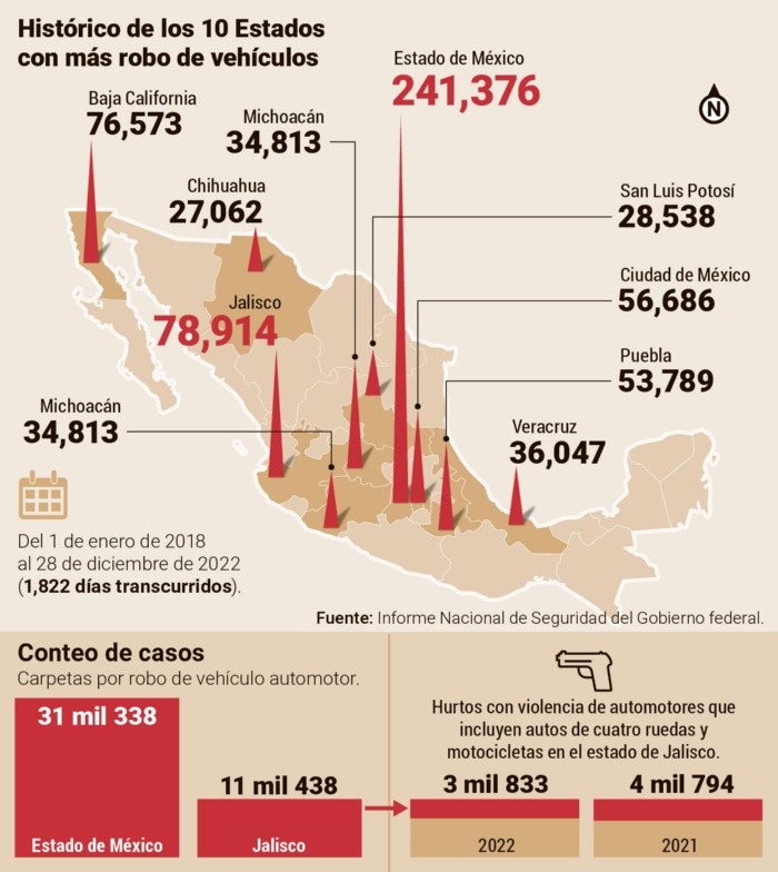 Entre enero de 2018 y diciembre de 2022, en el país se robaron más de 943 mil vehículos. De esa cantidad, 78 mil 914 fueron de Jalisco: el 8.4 por ciento, según el Informe Nacional de Seguridad del Gobierno federal. El pasado 24 de diciembre, elementos de las Policías de Guadalajara y Tlajomulco recuperaron un auto con reporte de robo a tan sólo tres horas de que se cometiera el delito. De acuerdo con las autoridades, el patrullaje estuvo coordinado por el C4 de Tlajomulco, que detectó la unidad hurtada en Lomas del Mirador. Un adolescente fue detenido.Otro caso en el que se utilizó la tecnología ocurrió en noviembre de 2022, cuando un vehículo Nissan, cuyas características coincidían con las de un automotor con reporte de robo en la línea de emergencia 911, fue recuperado gracias al sistema de videovigilancia. El Escudo Urbano recomienda que cuando una persona sea víctima de este ilícito, debe reportar de forma inmediata al 911 y proporcionar los datos del último lugar en el que se ubicaba el vehículo. Además, la autoridad estatal cuenta con una plataforma para que los ciudadanos puedan consultar si su auto fue recuperado (https://fiscalia.jalisco.gob.mx/content/vehiculos-recuperados).Jalisco tiene el segundo lugar nacional en robo de vehículos según el histórico del Informe Nacional de Seguridad del Gobierno federal, que hace un recuento de enero de 2018 al 28 de diciembre de 2022. El primer lugar lo tiene el Estado de México.En el cuarto informe del Gobierno estatal se dio a conocer que entre enero y septiembre del 2022 habían sido recuperados 365 vehículos con la participación del C5. Sin embargo, muchos ciudadanos se quejan por los trámites engorrosos para la recuperación de sus vehículos. Por ejemplo, Adriana López cuenta que hace tres meses le robaron su auto. “Lo encontraron una semana después, pero para sacarla tuve que hacer muchos pagos. La verdad debía el refrendo de dos años porque la economía ha estado mala, y tuve que pedir prestado para sacarlo. Fue bueno que lo encontraran, pero malo por lo que hay que pagar”.Otros ciudadanos han señalado irregularidades en los corralones. Por ejemplo, en la recomendación 5/2021 de la Comisión Estatal de Derechos Humanos de Jalisco (CEDHJ) se informó que el peticionario fue víctima de robo de su automotor en febrero de 2020, el cual fue localizado y recuperado el día 13 de ese mes y año por la Policía de Zapopan, bajo mando y conducción de un agente del Ministerio Público adscrito al Centro Vehicular de Devolución Inmediata (CVDI). En la explicación de los hechos, se dio a conocer que una grúa de una empresa privada llevó el vehículo a un depósito vehicular a cargo de la Dirección de Depósitos Vehiculares de la Secretaría de Administración del Estado, para su custodia. “Una vez que al agraviado le fue otorgada la devolución del automotor y exentado del pago correspondiente por guarda y custodia por haber sido objeto de robo, le hicieron un cobro excesivo por el servicio de grúa que no correspondió a la tarifa autorizada aplicable, advirtiendo también que dicha empresa no cuenta con permiso, concesión u autorización alguna por parte de la Secretaría de Transporte para prestar ese servicio; por lo que la Comisión Estatal de Derechos Humanos documentó varias omisiones e irregularidades de personal de la Dirección de Depósitos Vehiculares que permitieron victimización secundaria al quejoso”.El Sistema Nacional de Seguridad Pública informó que han identificado páginas falsas que ofrecen la regularización de vehículos de procedencia extranjera, por lo que remarcó que el único sitio para generar la cita es en https://regularizaauto.sspc.gob.mx/.“El Repuve no cuenta con WhatsApp, ni te solicita pagos a cuentas Oxxo o SPEI. Únicamente podrás realizar el pago para la regularización de tu vehículo directamente en los bancos autorizados con una línea de captura del SAT, disponible en https://pccem.mat.sat.gob.mx/PTSC/cet/FmpceContr/faces/resources/pages/pagos/formularioMultiplePago.jsf”.Para regularizar un vehículo se pide generar una cuenta en línea, llenar una carta bajo protesta de decir la verdad, y realizar un pago único por aprovechamiento de dos mil 500 pesos.Este mes se informó que a partir de la incorporación de Jalisco al programa de regularización de vehículos de procedencia extranjera, el pasado 20 de septiembre, se han regularizado dos mil 124 automóviles en el Estado, según la titular de la Secretaría de Seguridad y Protección Ciudadana, Rosa Icela Rodríguez.
